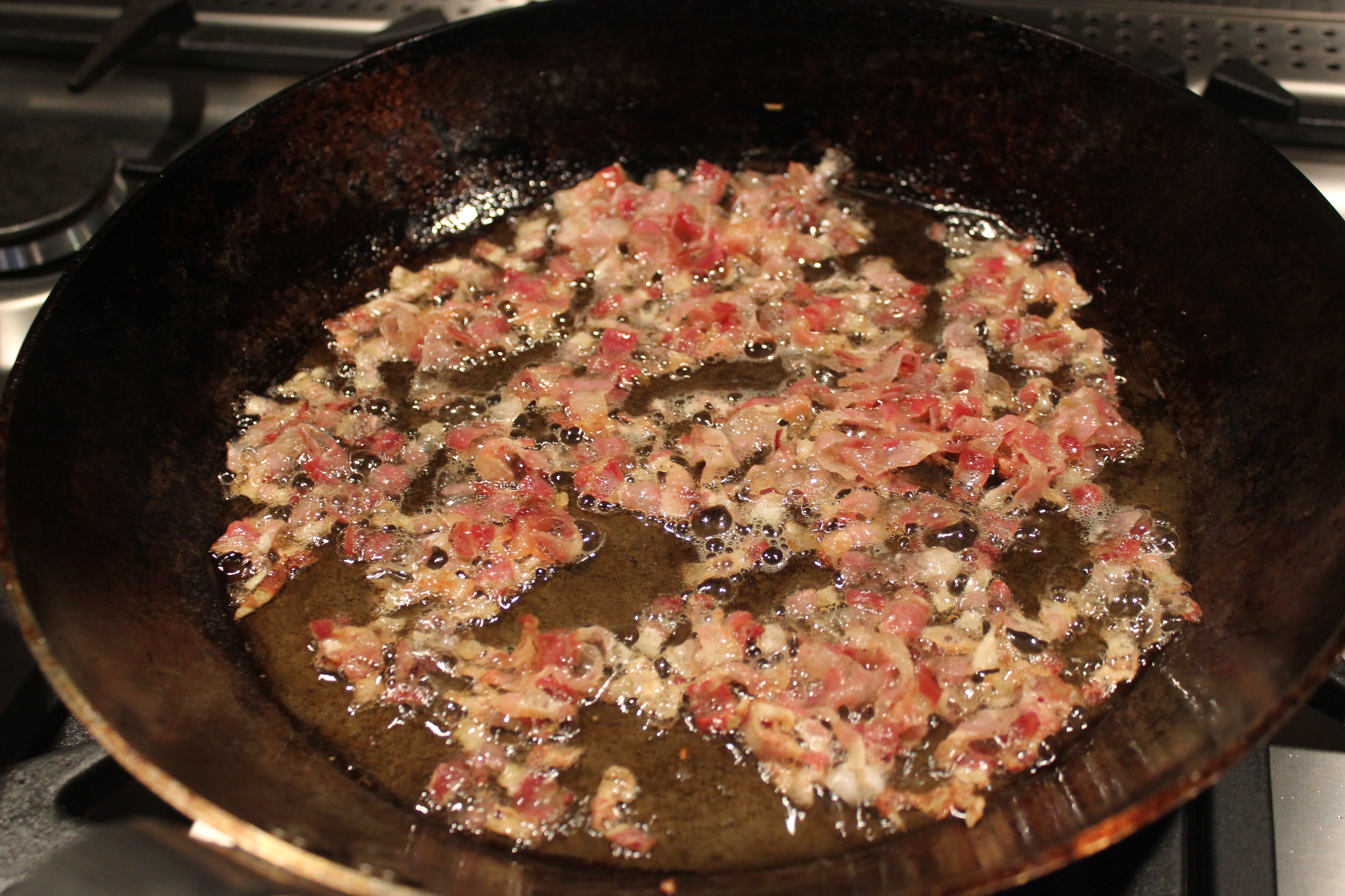 Strimla pancetta och fräs i en stor stekpanna eller gryta tills den börjar få lite färg. Finhacka morot, selleri, lök och vitlök och lägg i det med pancettan, sänk värmen. Låt det hela fräsa på låg- till medelvärme tills löken börjar bli genomskinlig utan att ta färg. Lägg i köttfärsen, höj värmen något och fördela den med en stekspade eller träsked. Låt den fräsa tills den den inte är röd längre. Häll på vinet och låt det nästan koka in. Häll i tomater, chili och en nypa socker.