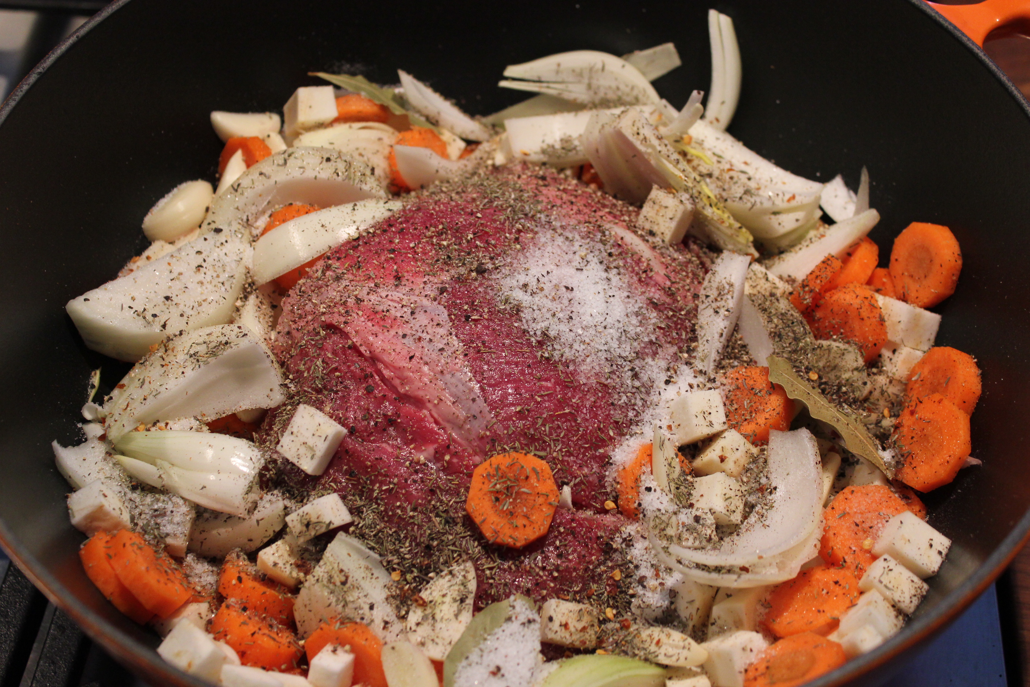 Lägg köttet i en gryta. Skala och klyfta löken och skala vitlöksklyftorna och dela dem på längden. Skala morötterna och skär dem i grova slantar. Skala rotselleri och skär i 1×1 cm tärningar. Lägg grönsakerna runt köttet. Tillsätt alla kryddor, vin och tomater. Koka upp och låt koka under lock i minst 3 timmar. När det har kokat klart tar du två gafflar och drar isär köttet i småbitar. Blanda ihop och koka ytterligare 30 minuter utan lock så att en del av vätskan kokar bort. Koka