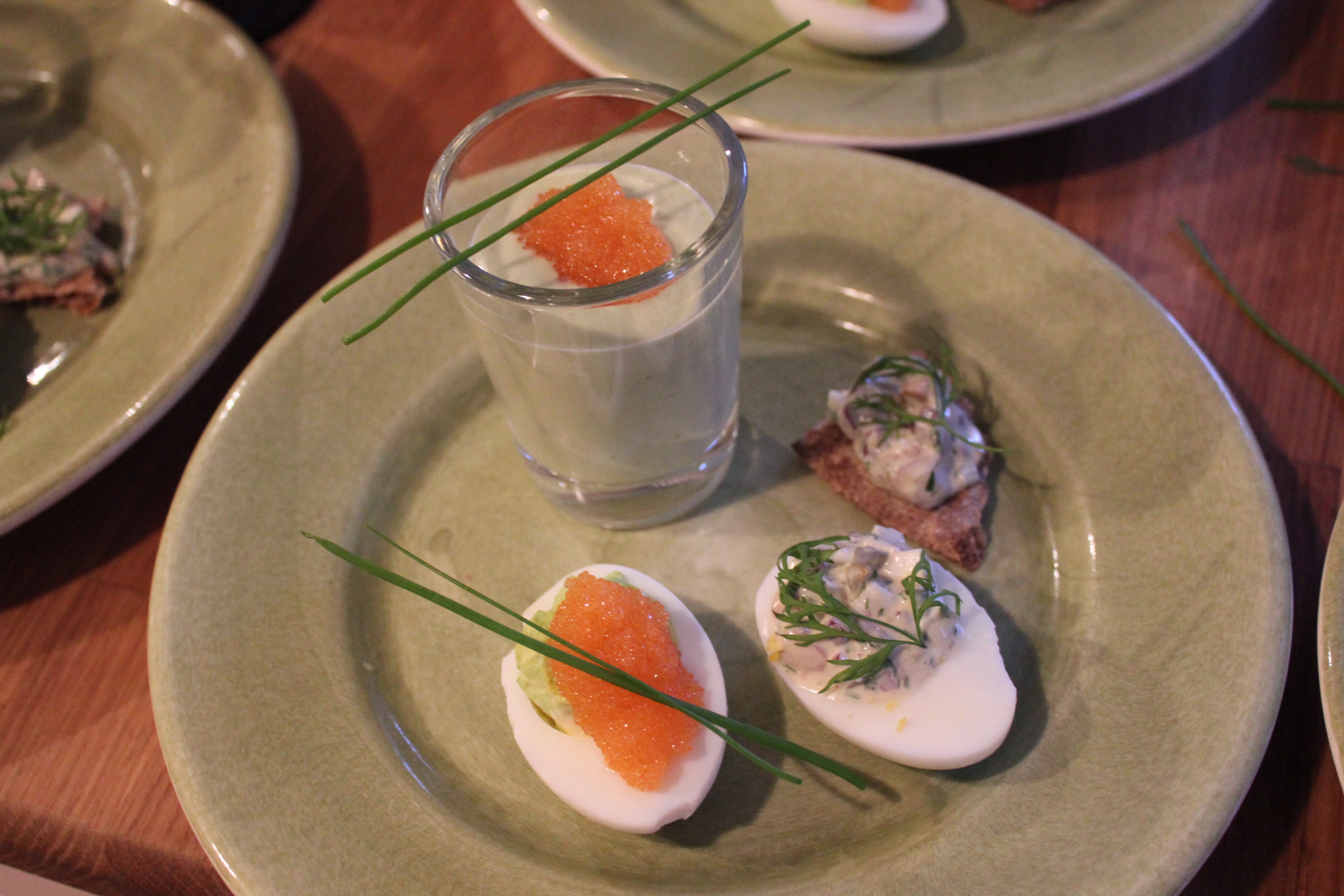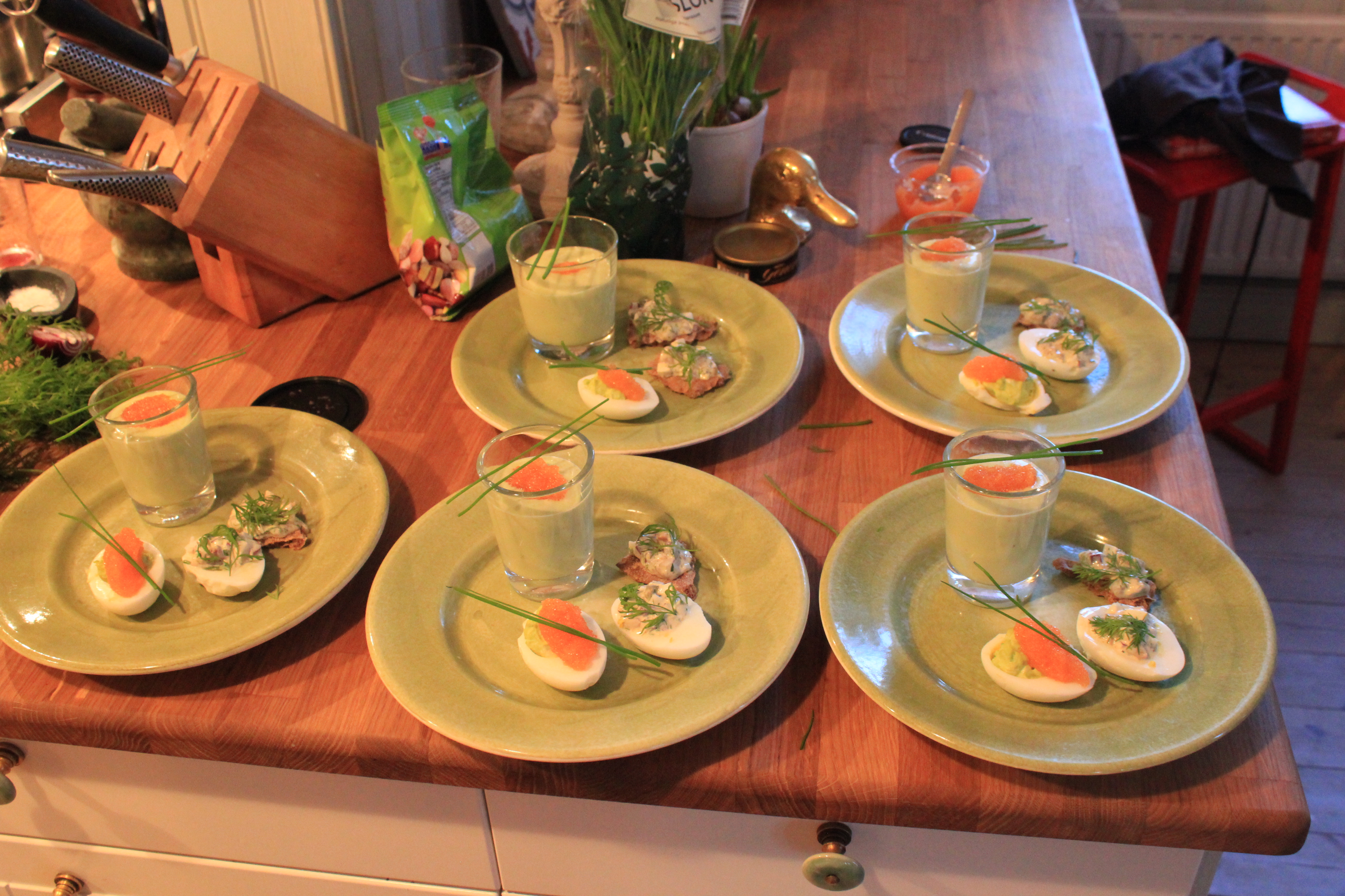 liten sillbit eller gravad lax i form av tapas, men nu blev det inte det. Jag gjorde två sorters fyllda ägg istället och en avokadosoppa. det ena ägget fyllde jag med en gubbröra och toppade med en dillkvist. Jag fullkomligen älskar gubbröra. Det andra ägget fick en röra på kokta ärter och kesella, toppat med en klick löjrom. Avokadosoppa är löjligt gott och kommer att återkomma som förrätt eller ensamrätt i sommar.