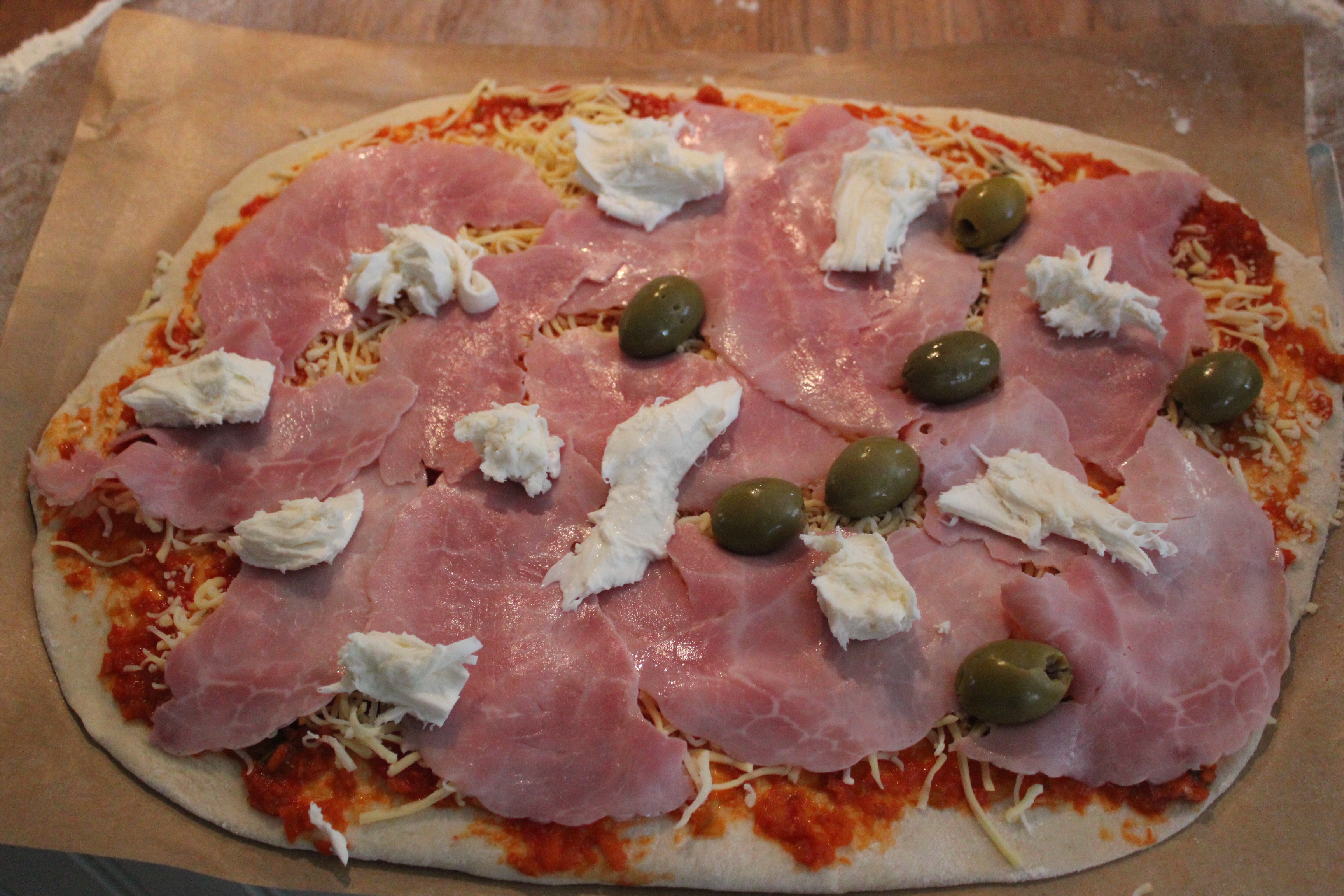 Kavla ut degen så att den passar din baksten eller en form. Bred ett tunt lager tomatsås över pizzan och bred ut riven ost. Fördela skinka och bryt mozzarellan i mindre bitar. Avsluta med gröna oliver.