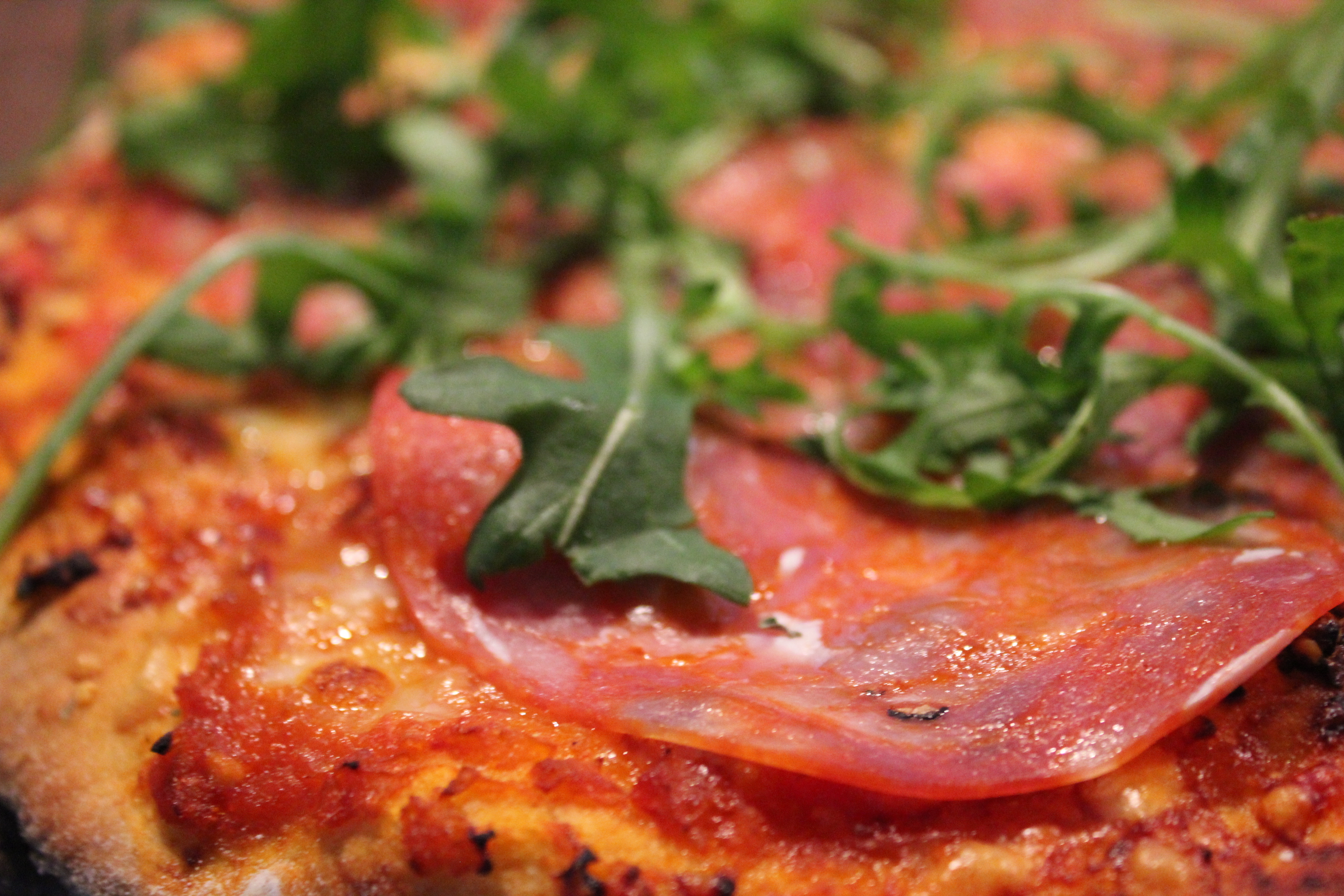 Lägg på tomatsås och ost och låt pizzan gå klart i ugnen. När den är färdig lägger du på salamin och strör ruccola och torkad oregano över hela härligheten