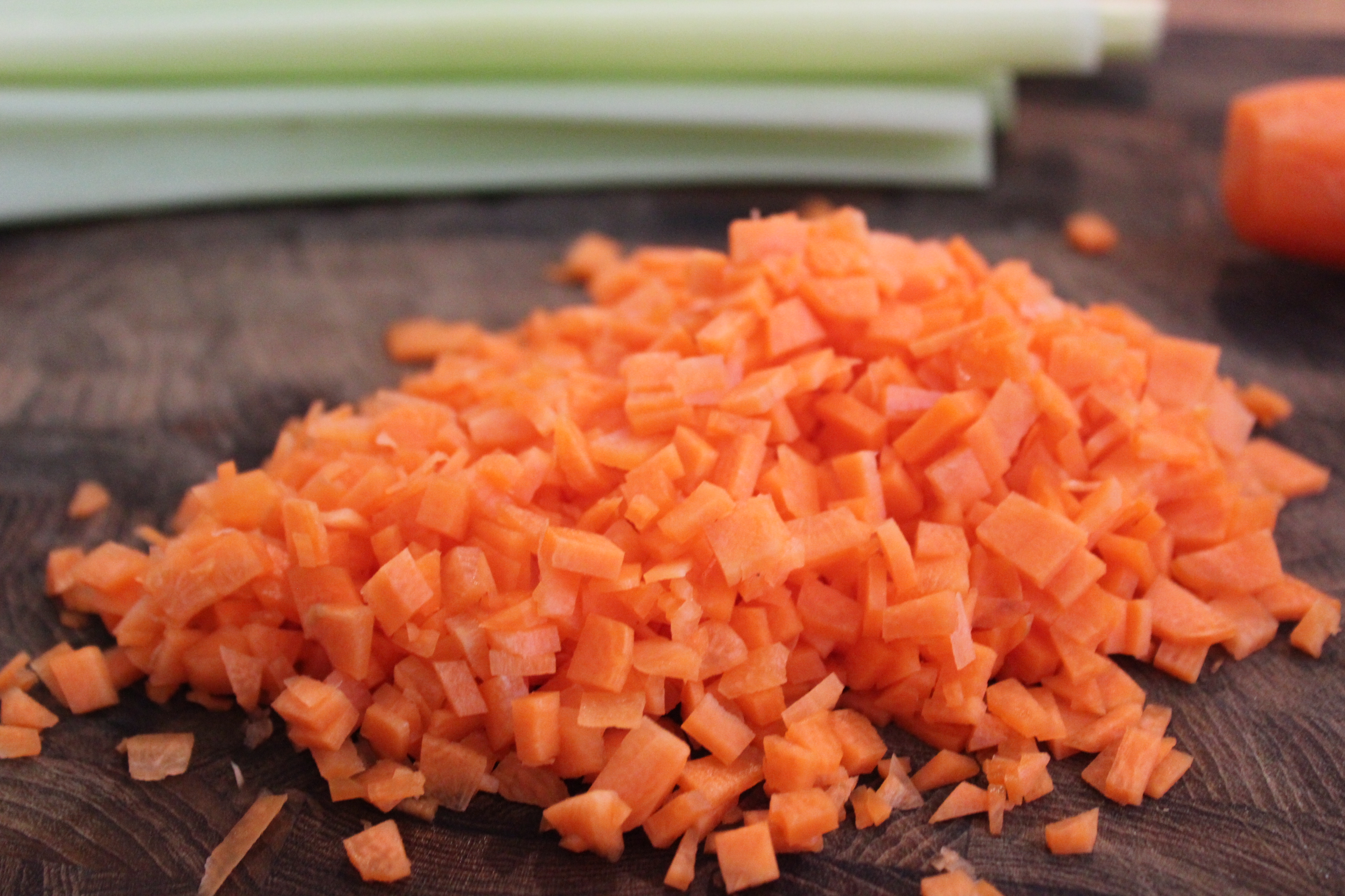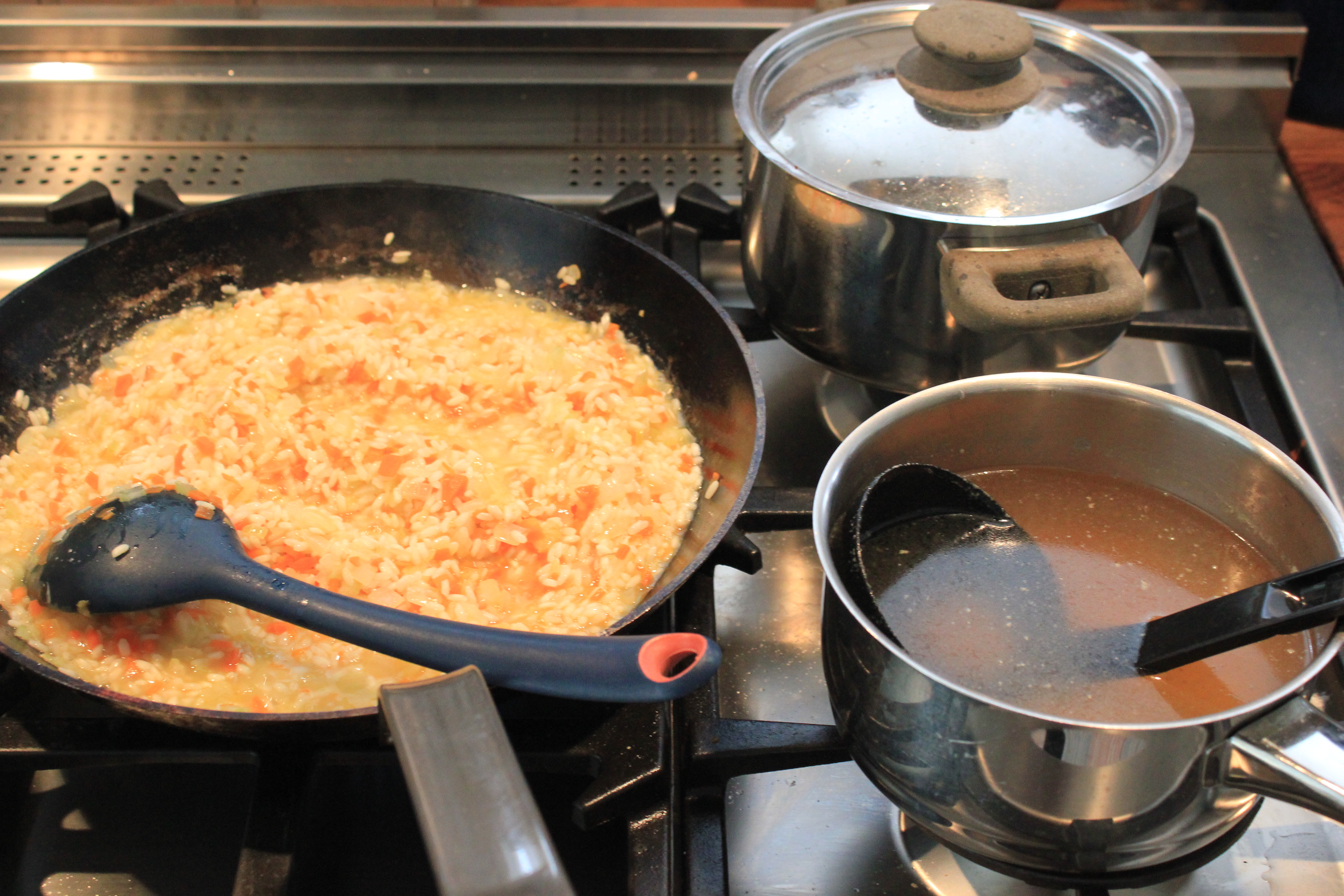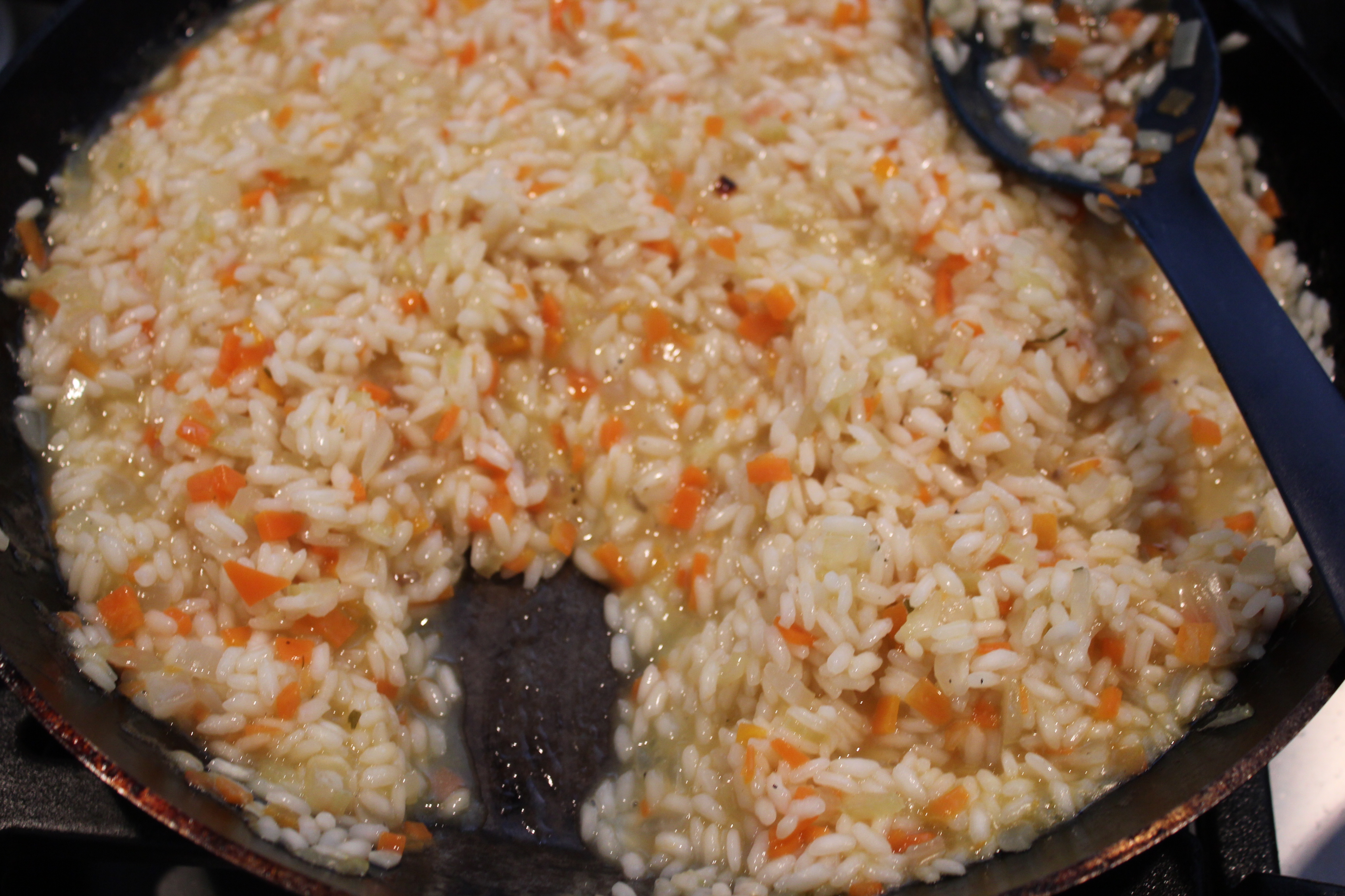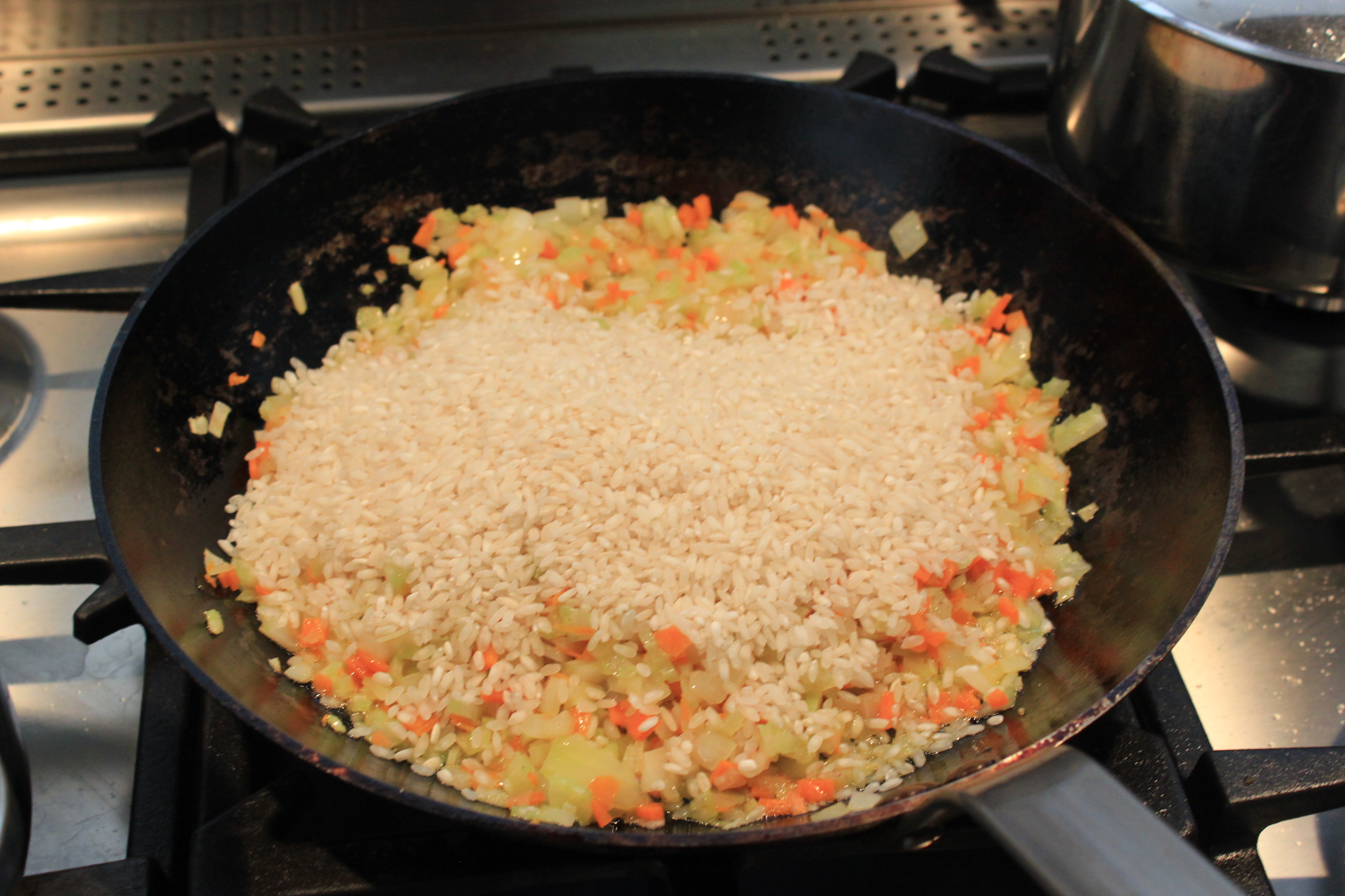 Börja med att finhacka selleri, morot, lök och vitlök. Koka upp hönsbuljongen i en kastrull på spisen. Dra ner värmen, sätt på ett lock och håll den varm. Värm lite olivolja i en bred panna med höga kanter. Fräs grönsakerna tills de mjuknat och löken börjar bli genomskinlig, utan att ta färg. Lägg i riset och låt det fräsa en stund. Detta är viktigt, eftersom det ”öppnar upp” riset så att smakerna kan tränga in. När riset också börjar bli lite genomskinligt, eller typ som frostat glas, häller du i vinet. Låt vinet nästan helt koka in. Nu är det dags att med