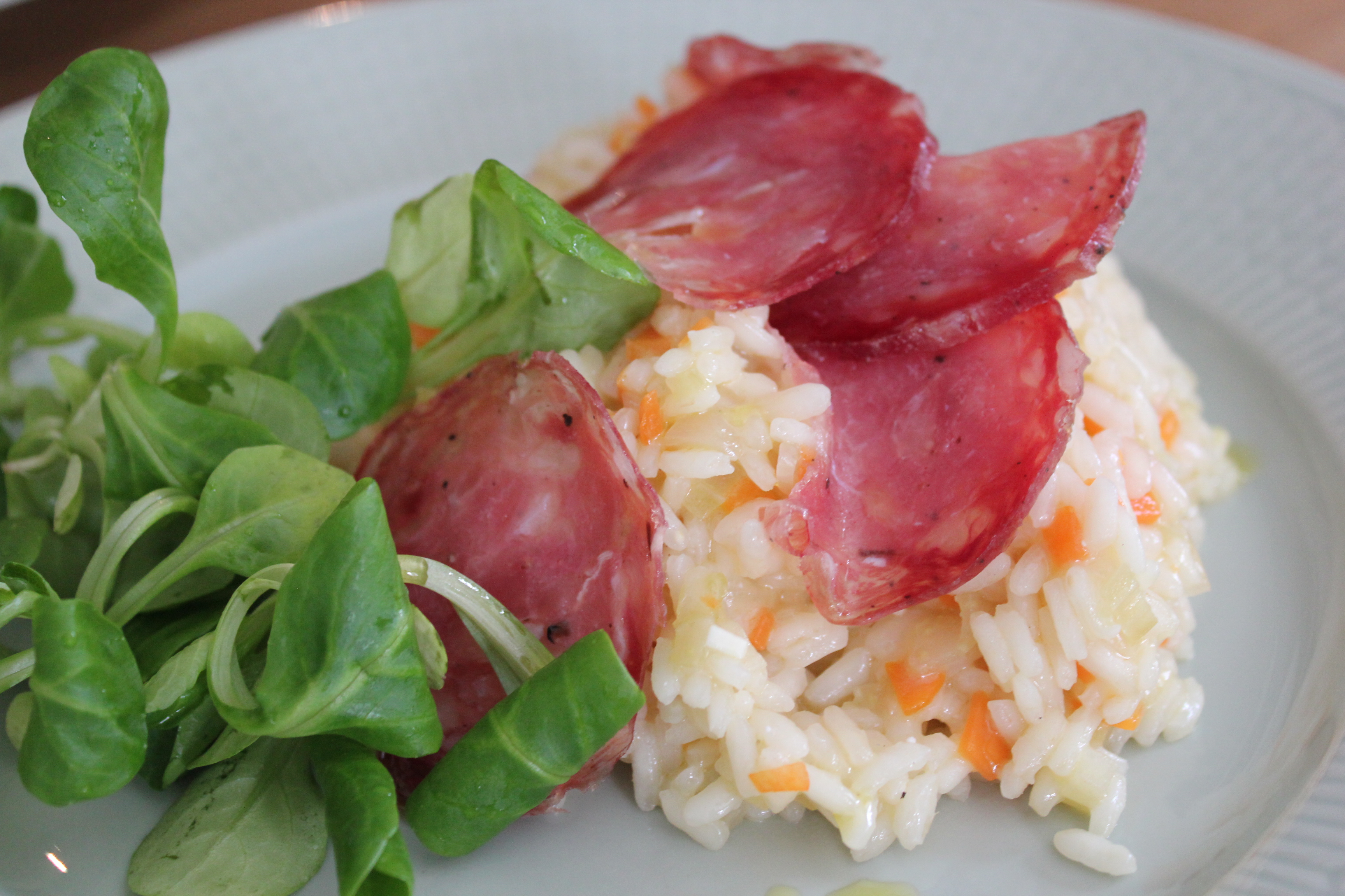 Risotto bianco con salame al tartufo, låter märkvärdigt, eller hur. På svenska skulle man kunna kalla rätten ris med korv, men det blir
