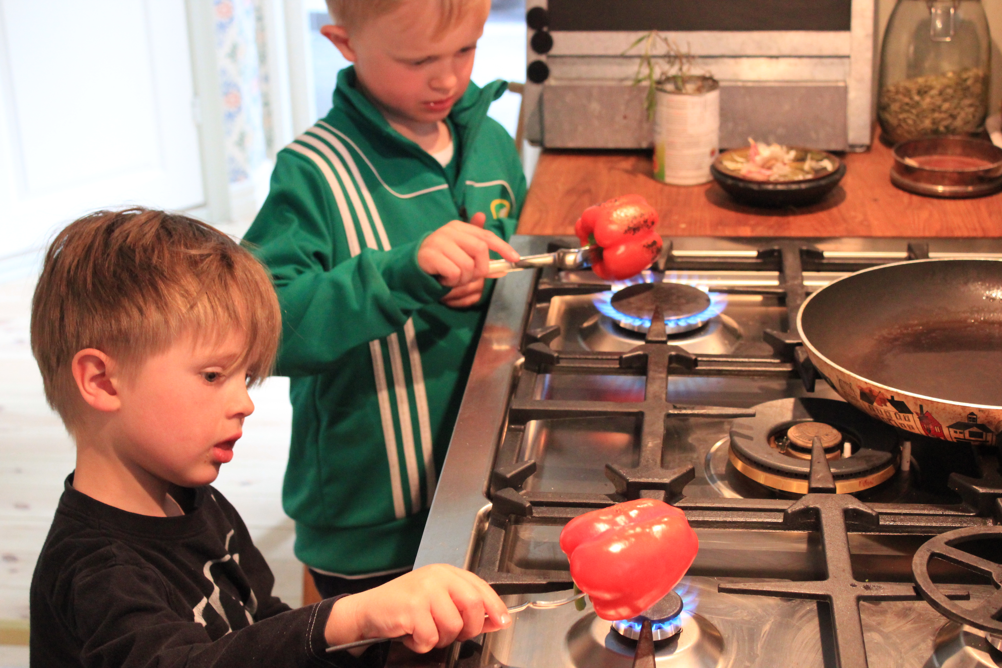 När köttet marineras i kylen kan du rosta paprikorna. Antingen över öppen gaslåga om du har en gasspis eller genom att dela dem på längden, kärna ur dem och lägga dem med skinnsidan uppåt i en form under grillelementet i ugnen. Paprikans skal ska bli svart. När paprikorna är rostade lägger du dem i en plastpåse som knyts ihop. Låt dem ligga tills de svalnat. Skalet är sedan lätt att skrapa bort med en kniv. IMG_2015