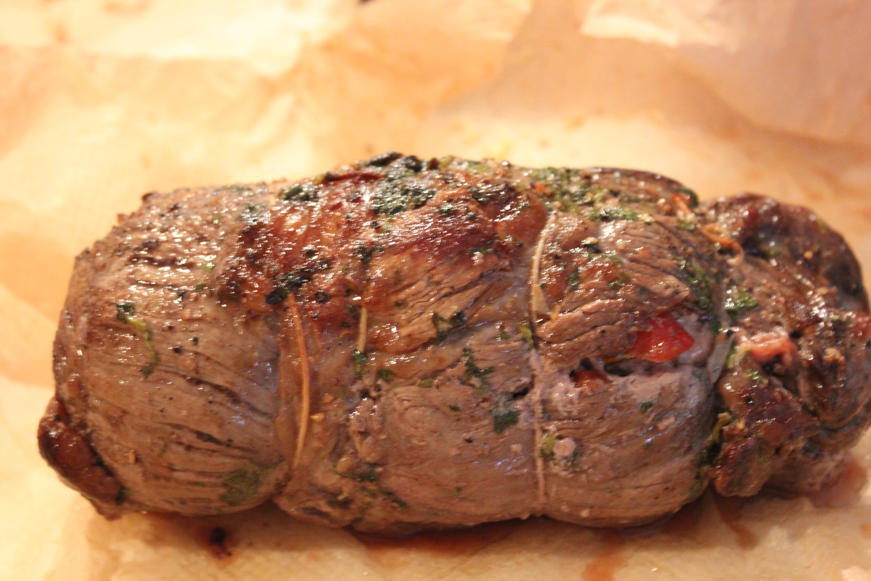 Värm ugnen till 175 grader. Lägg köttet, utfläkt på en skärbräda. salta och peppra. Grovhacka paprikan och sprid ut den över köttet. Fördela prosciutto, basilikablad och persilja över paprikan. Riv över lite parmesan. Rulla ihop köttet till en stor rullad och bind ihop med steksnöre. Enklast är att klippa ut en 4-5 snörstumpar som du knyter ett och ett runt köttet. Lägg köttet i en ugnsform och häll över marinaden som är över i påsen. Jag fräste köttet i en panna för att få lite färg på det innan jag slängde in det i ugnen.