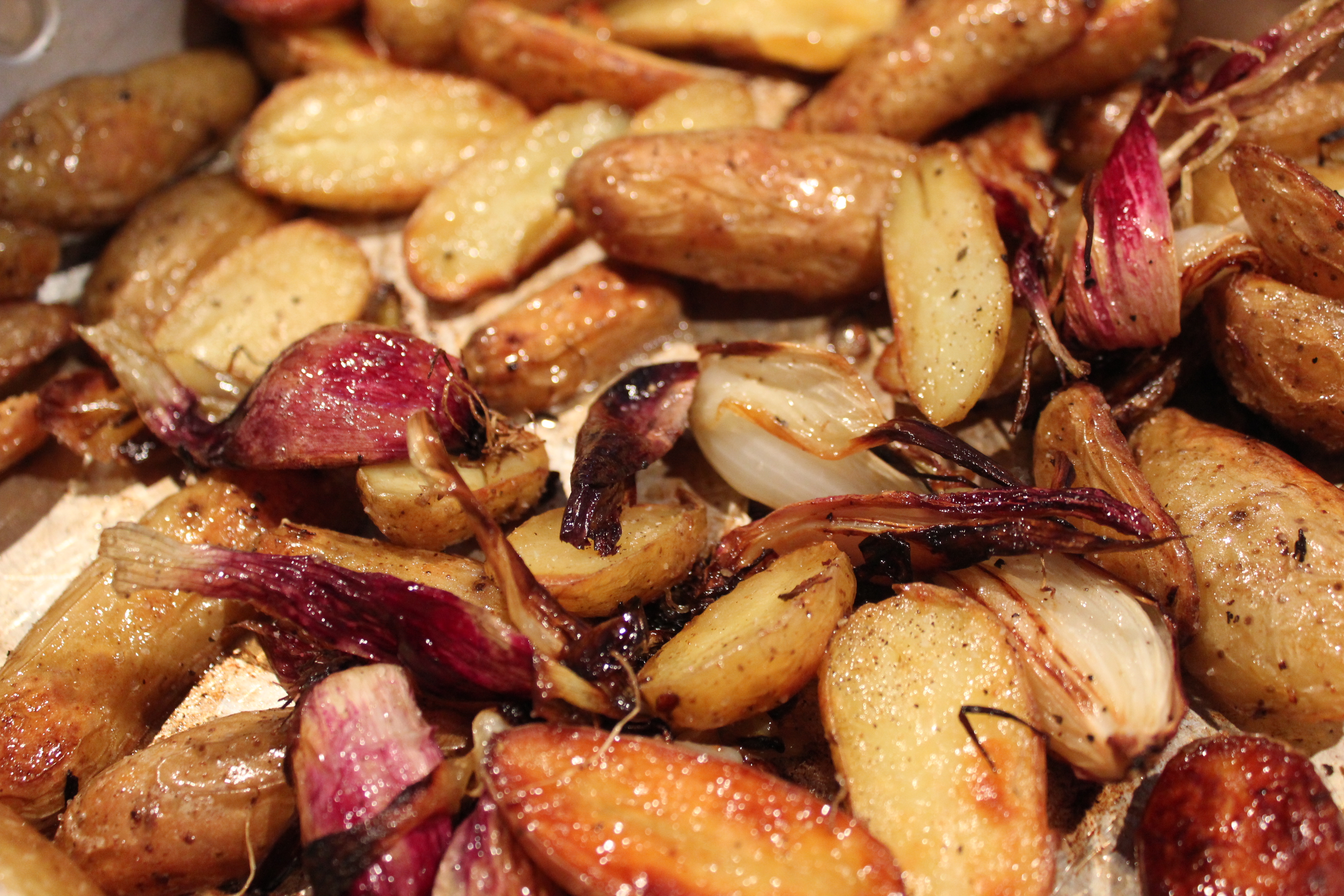 Dela din rattepotatis på längden. Dela den färska rödlöken i mindre bitar. Lägg potatis och lök i en ugnsform. Häll på lite olivolja och klicka i lite smör. Rosta i ugnen på 200 grader i ca 30-40 minuter. Under tiden grillar du kycklingen. Pensla med glacen mot slutet av grillningen. Vänd, pensla, vänd pensla osv. Se till att det inte är för varmt när du lägger på glacen och se till att använda all glace!