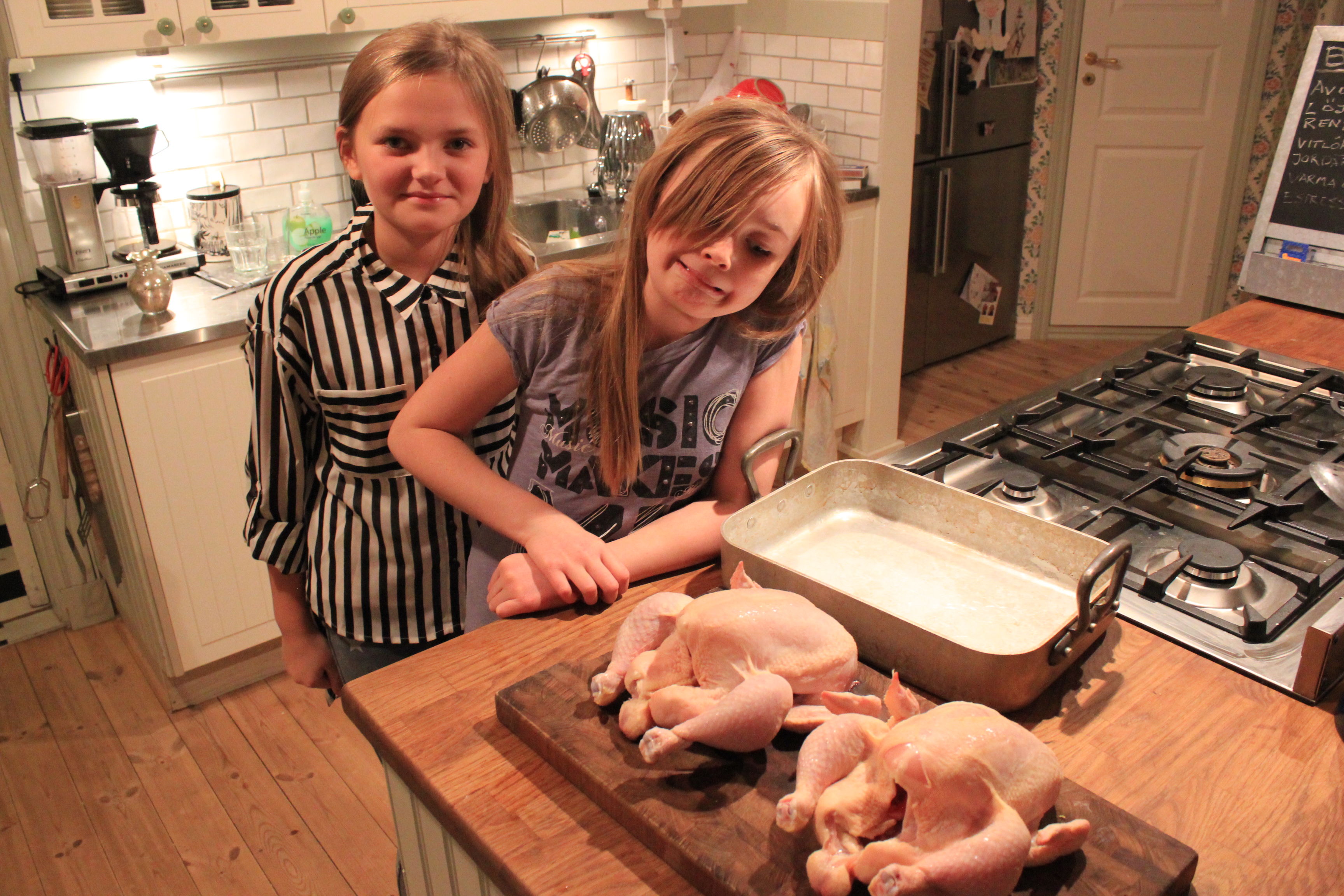 Lägg kycklingarna i en ugnssäker form med brösten uppåt. Sätt in dem i ugnen och grilla dem i ca en timme. Kolla gärna med en stektermometer där låret fäster vid kroppen. Kycklingen behöver inte bli varmare än 75 grader, annars blir den torr.