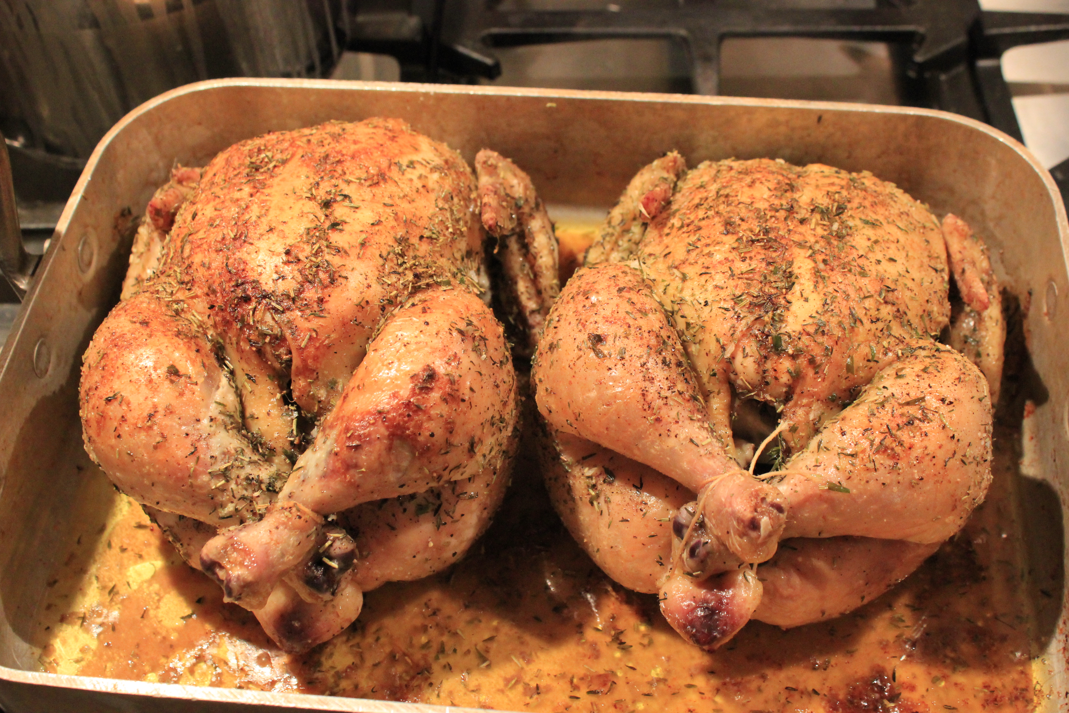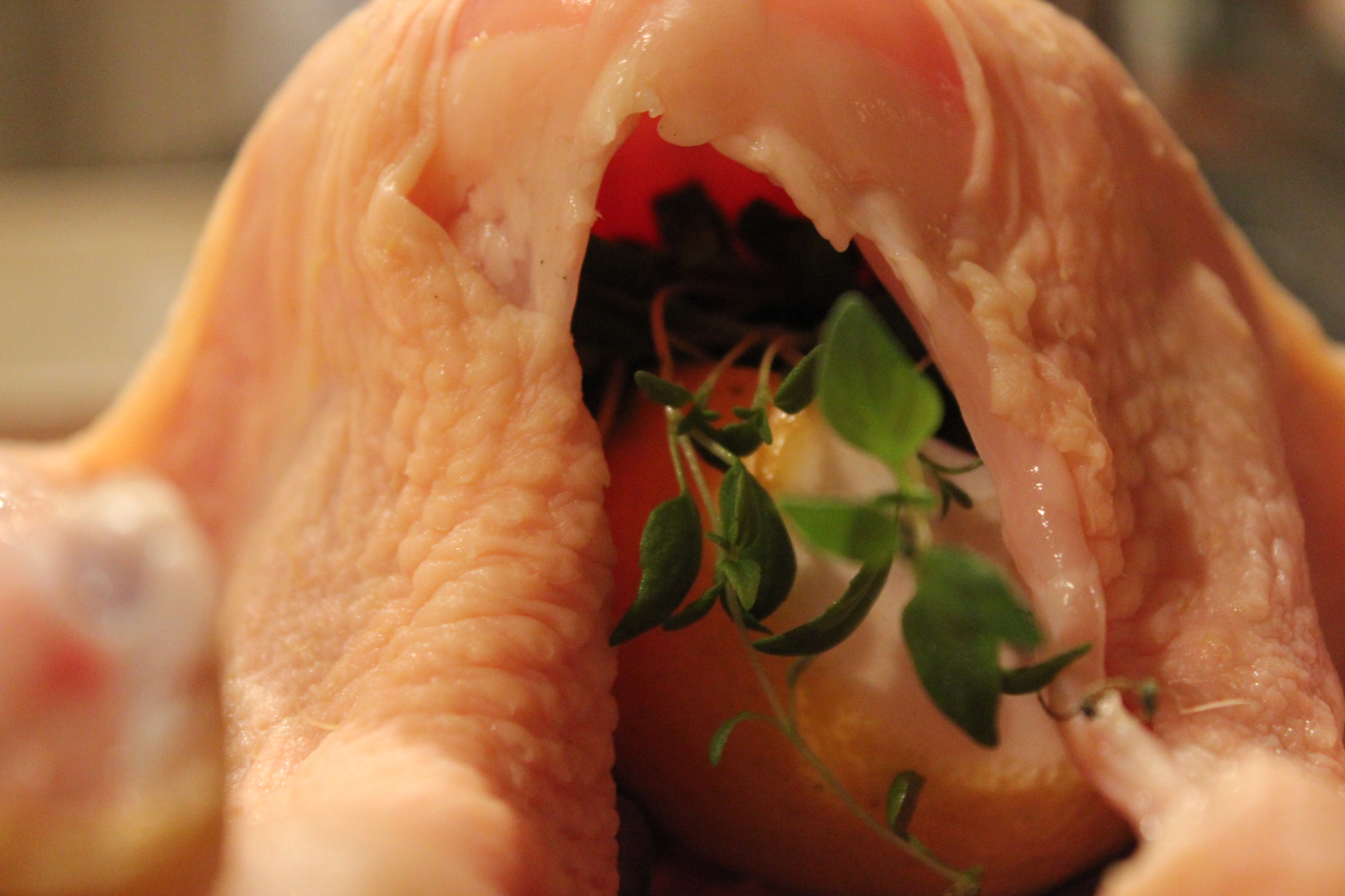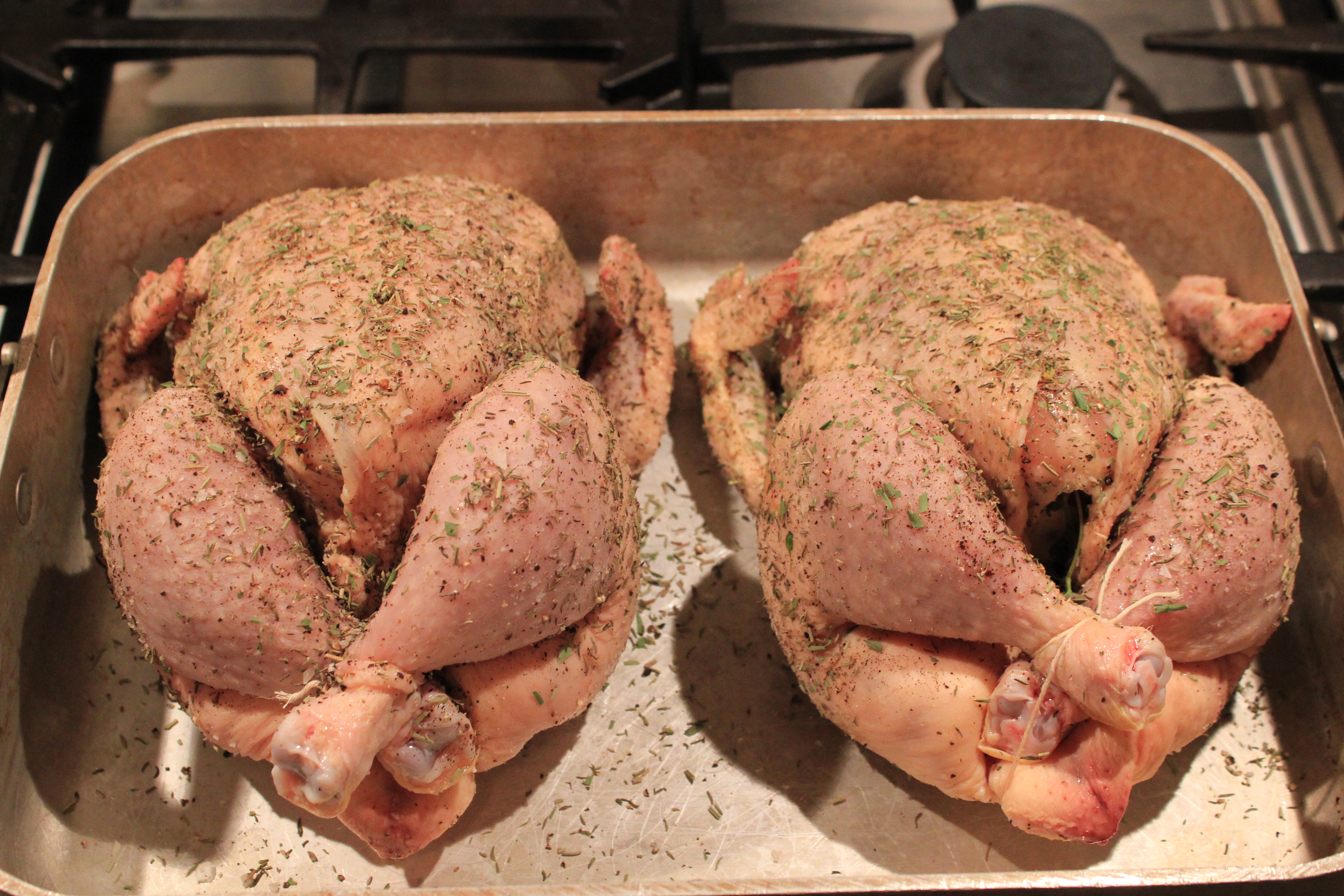 Sätt ugnen på 175 grader. Ta bort snöret som binder ihop låren. Skölj kycklingarna under kallt vatten. Klappa dem torra. Dela citronen och peta in en halva i vardera kyckling samt två vitlöksklyftor i varje och lite färska örter. Ta fram steksnöret och bind ihop låren så att hålet in i bukhålan täpps till. Det sista är inget måste men ger en saftigare kyckling. Klappa in alla kryddor i skinnet runt om kycklingen.