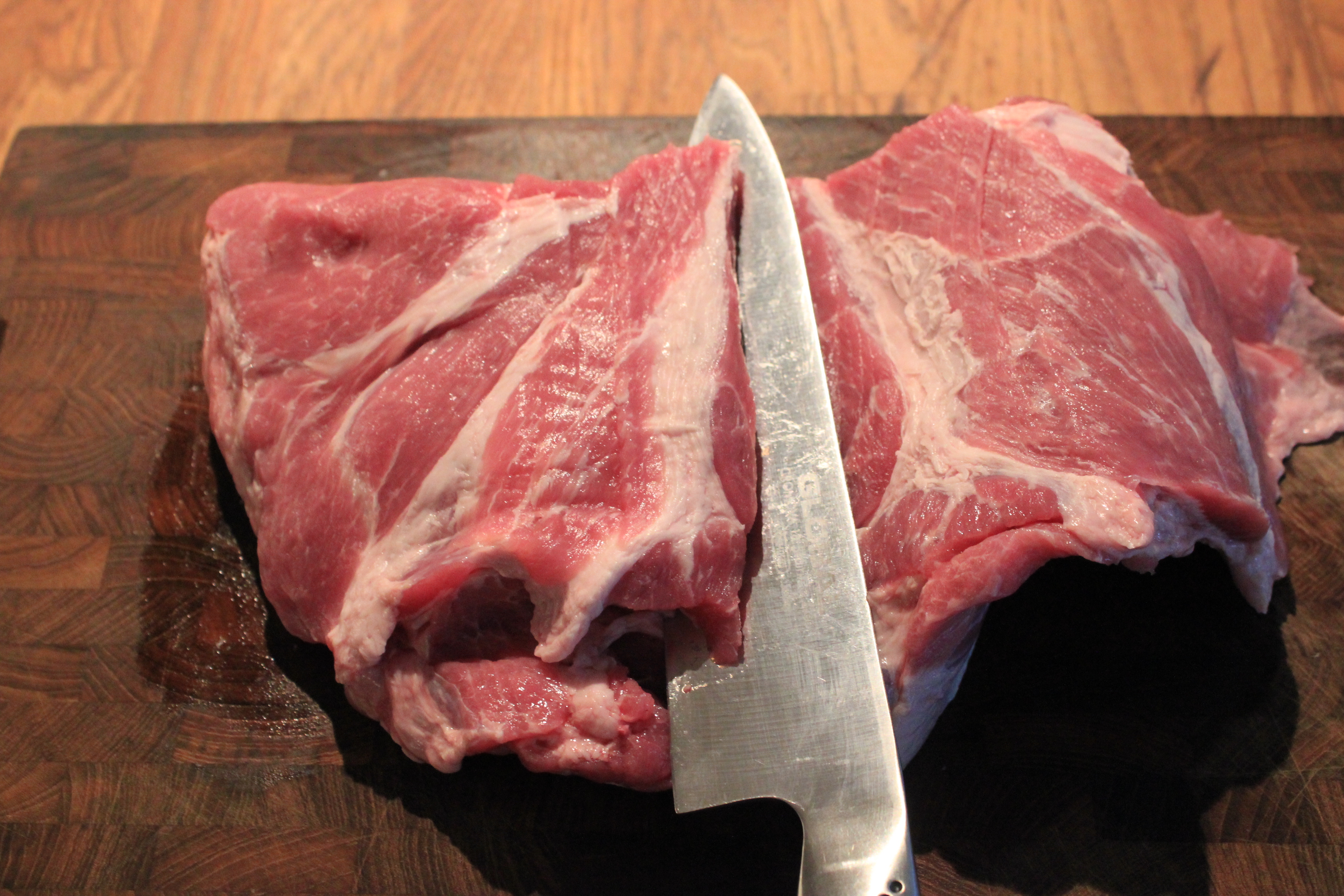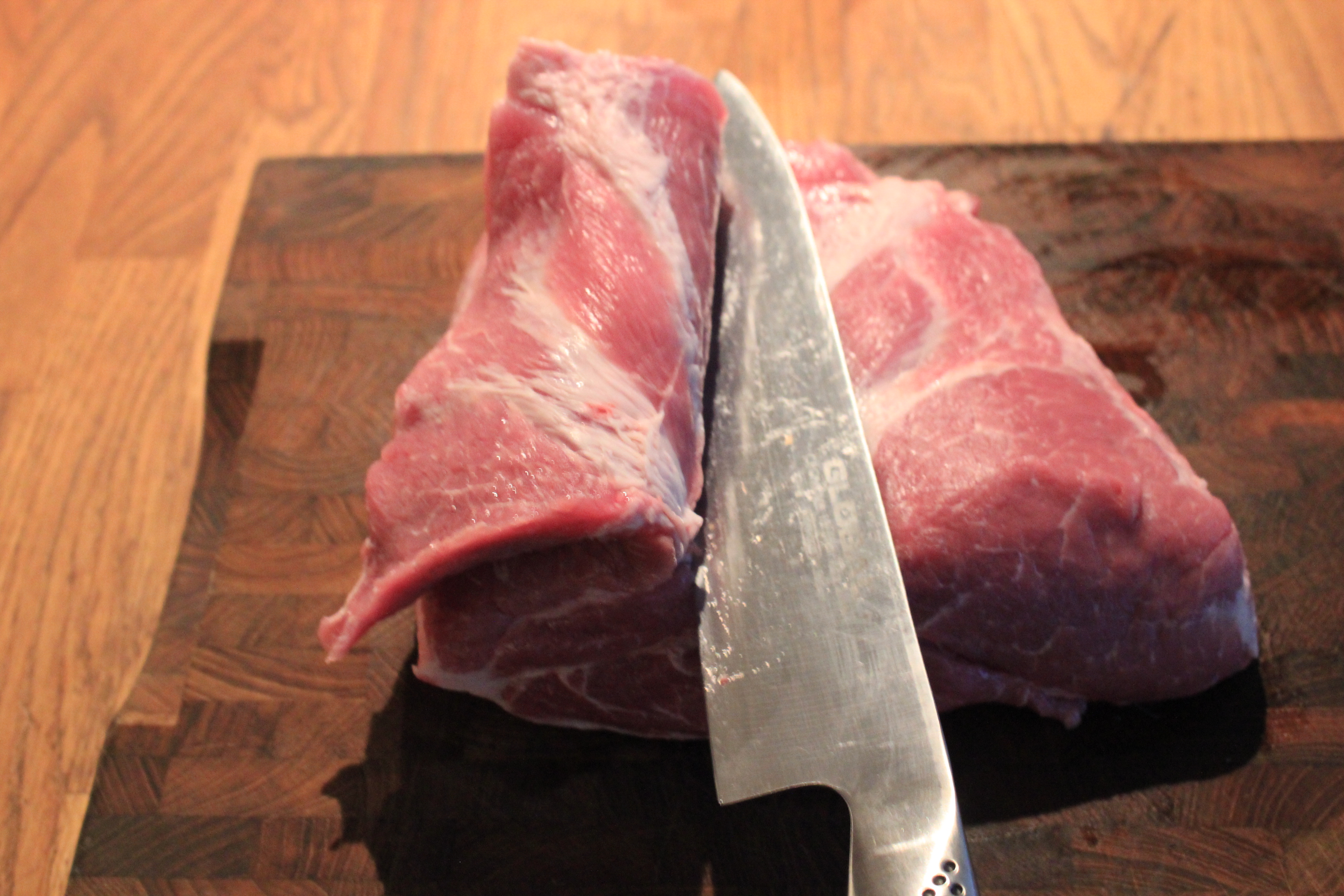 Börja med att skära upp fläskkarrén så att du kan vika ut den och sedan rulla ihop den. Jag har försökt att illustrera på bilderna.