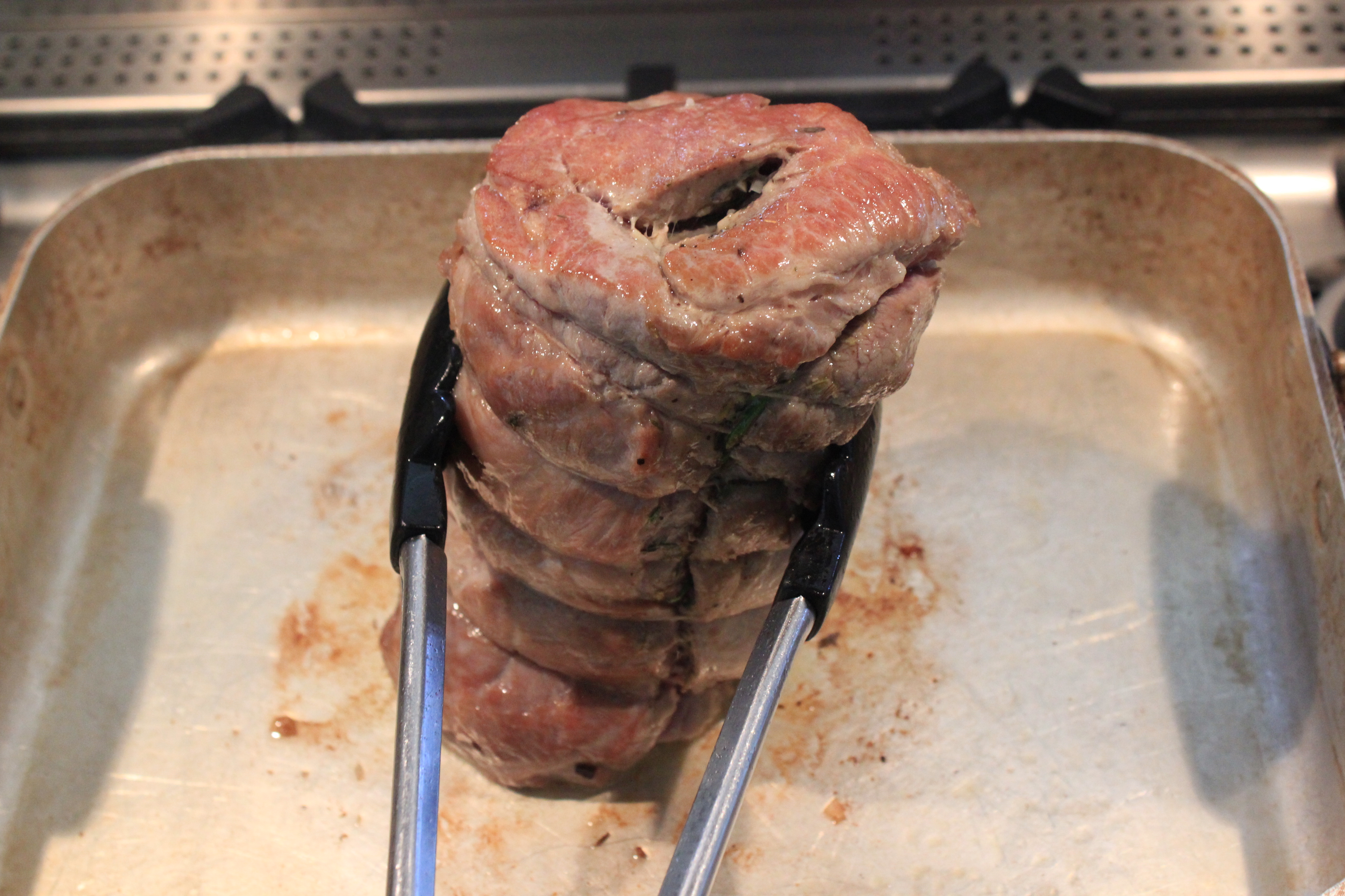 tills du har en innertemperatur på 75 grader. Det tar ungefär 3-4 timmar beroende på hur stor biten är. När det är en timme kvar, lite drygt, häller du en skvätt vitt vin eller vatten i formen. Detta kan du använda till en god sky senare.