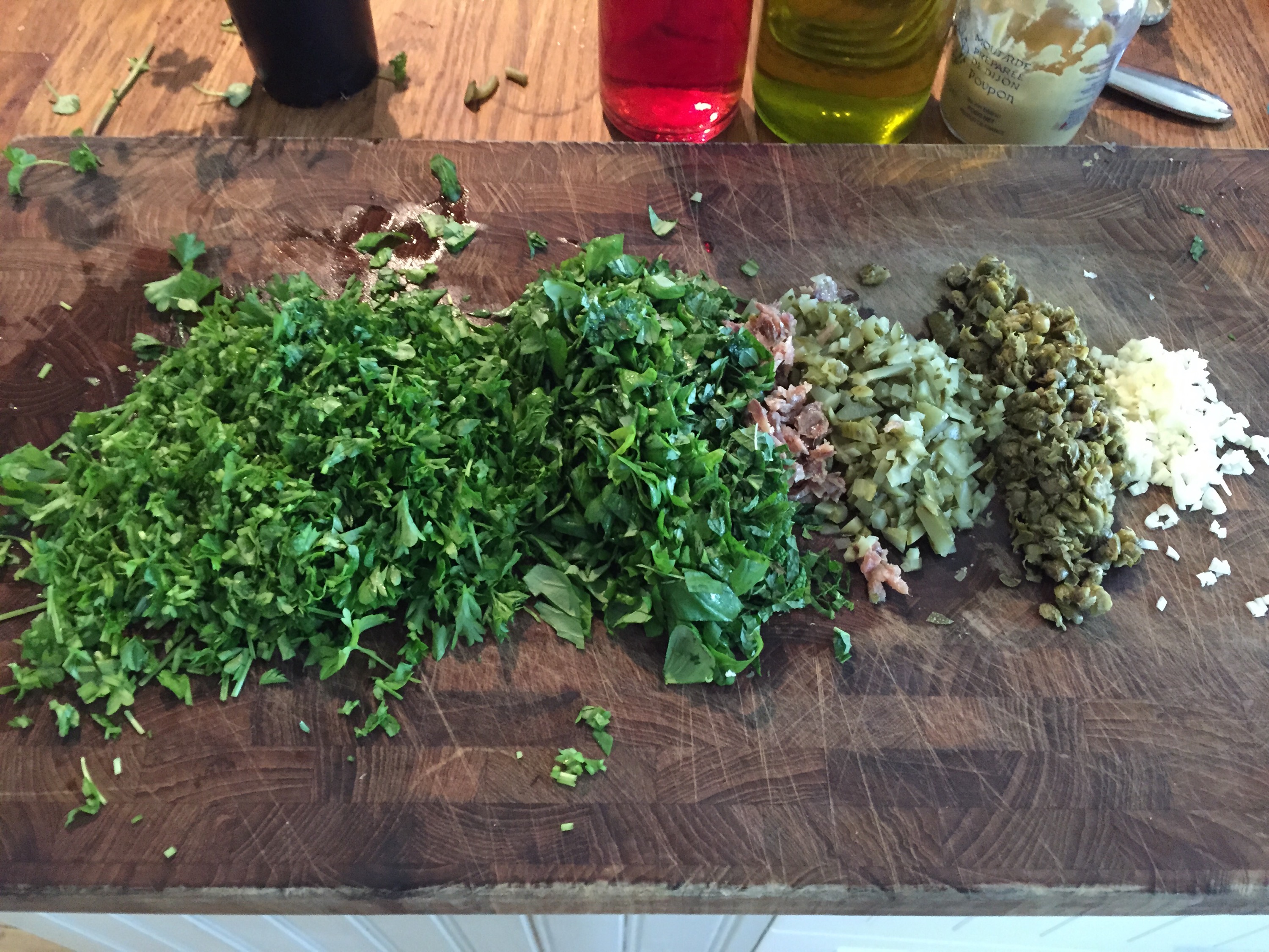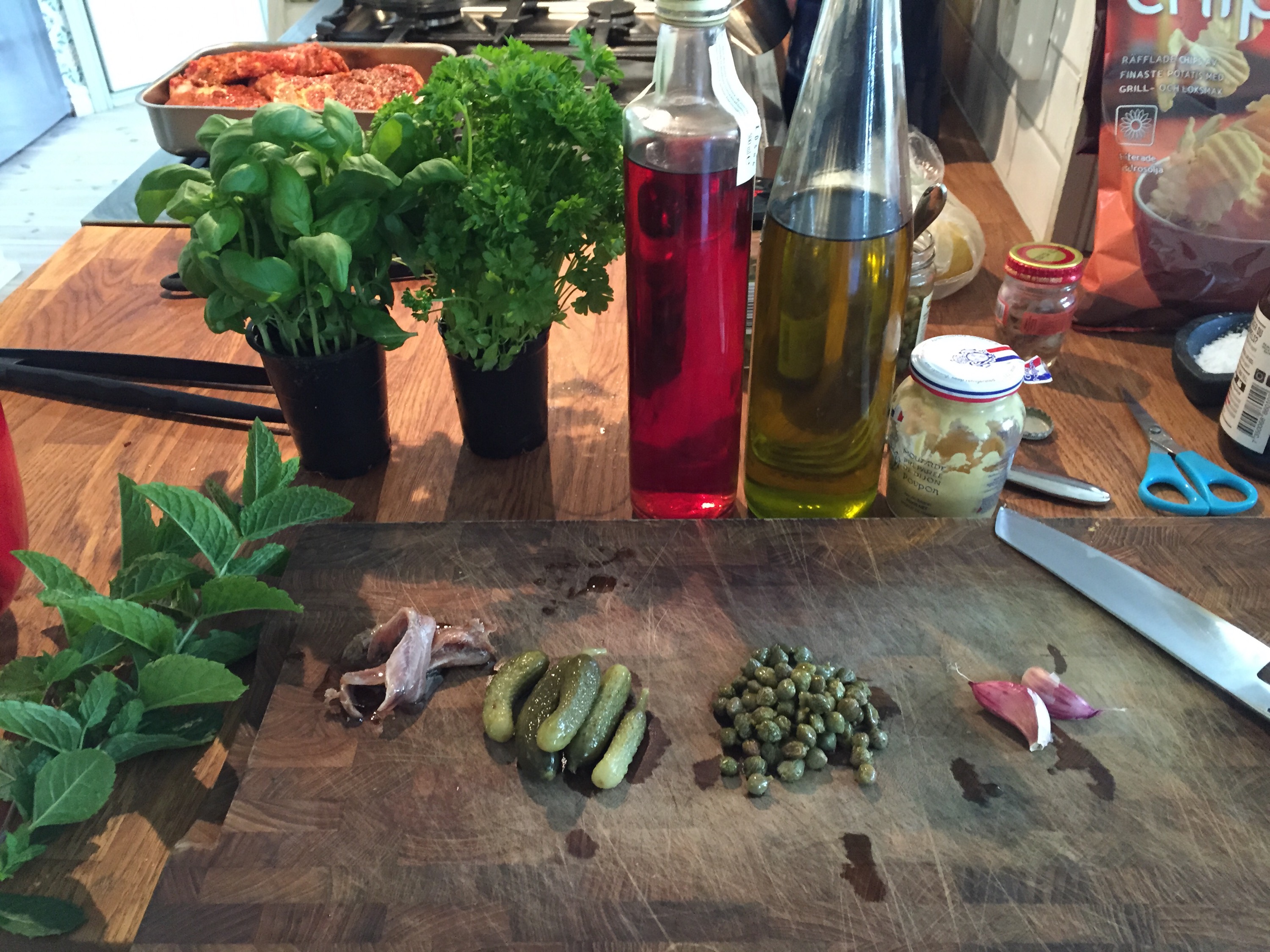 Hacka alla ingredienserna fint och blanda ihop med senap, olivolja och vinäger. Smaka av med salt och peppar.