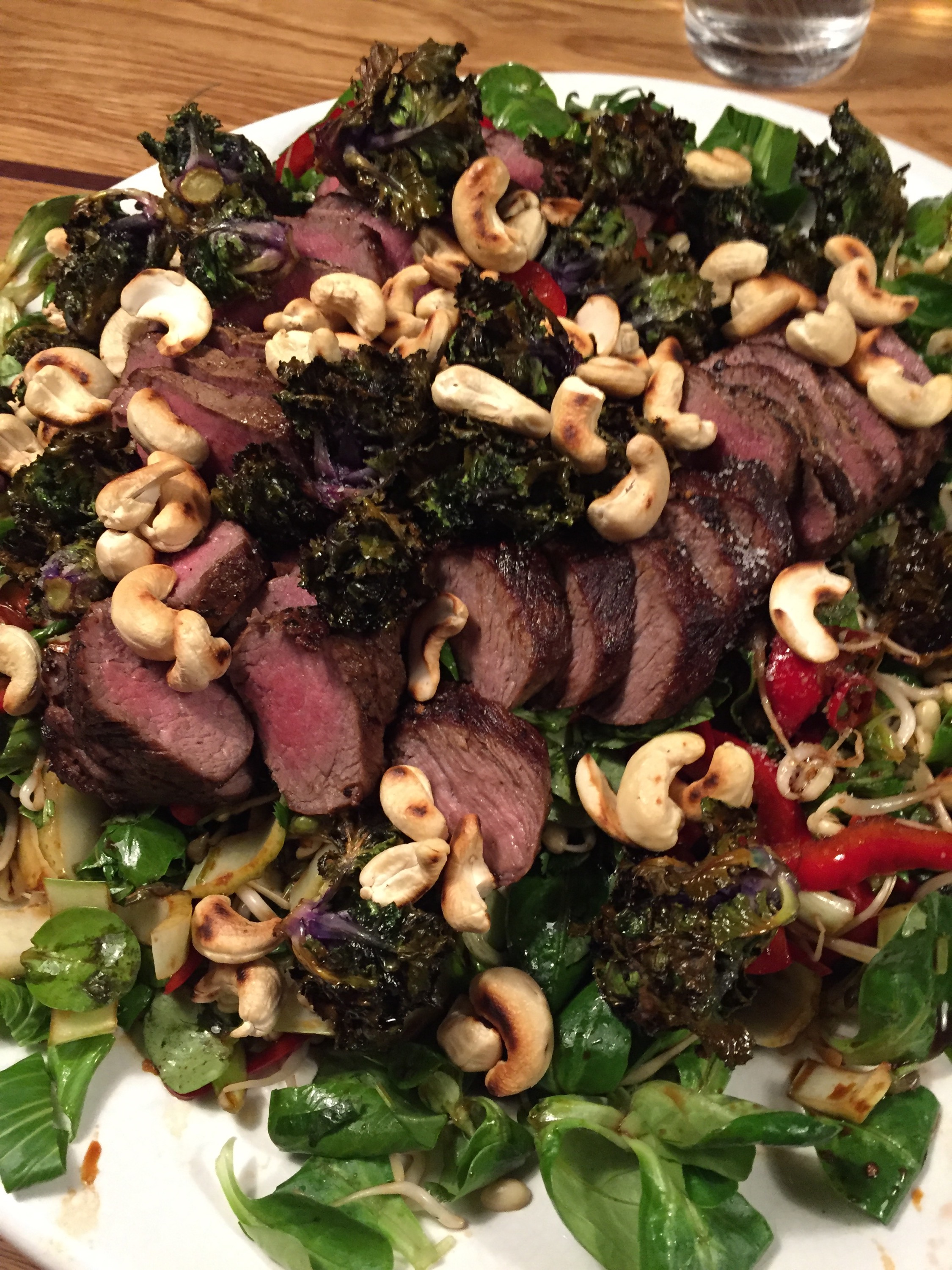 Lägg upp salladen på ett stort fat. Grovhacka koriander och basilika och blanda ihop. Häll på dressingen med allt och böngroddarna. Blanda runt. Ta ut ”flower sprouts” ur ugnen och salta. Skiva upp köttet i tunna skivor och placera på salladen. Strö över cashewnötterna och till sist ”flower sprouts”. Servera med ett gott vitt vin, gärna en riesling