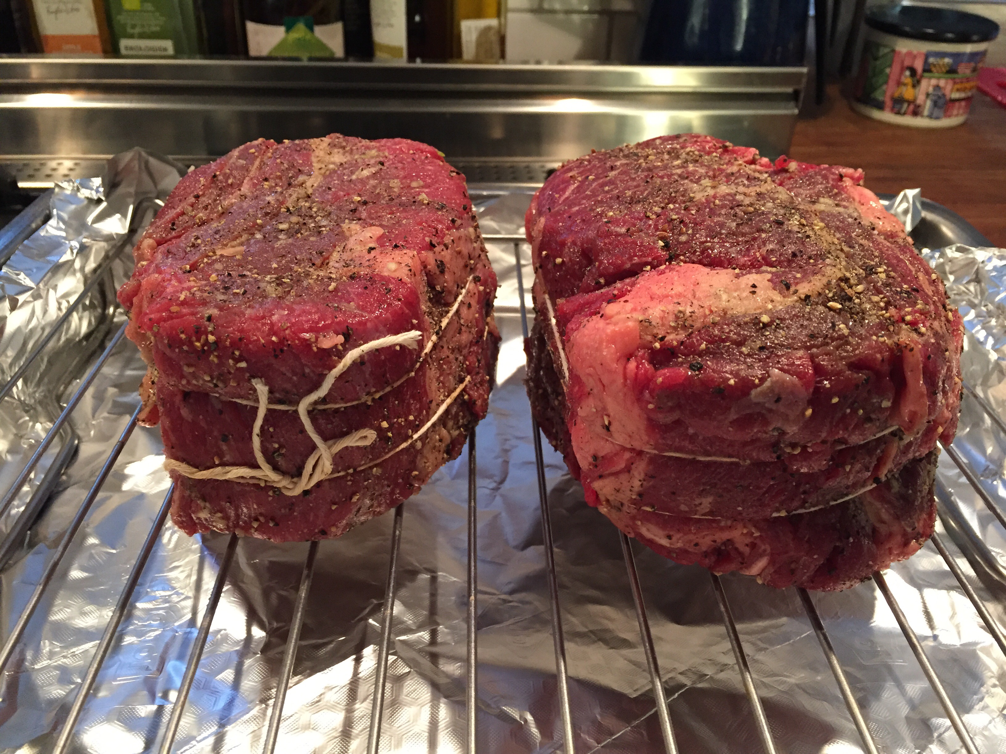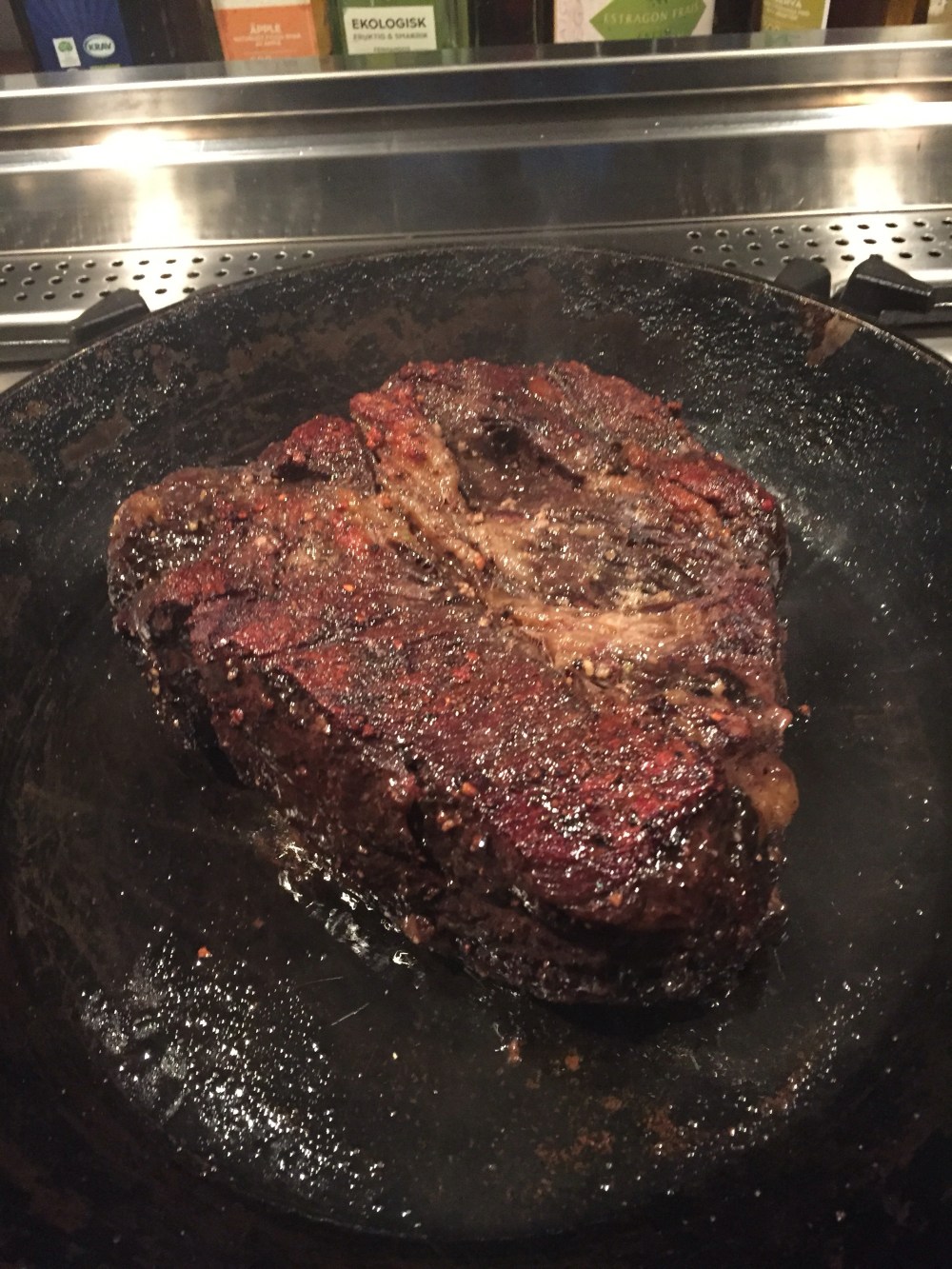 Testade för första gången att baklängessteka högrev och det blev riktigt bra. Jag tror att det är nödvändigt att vara noggrann med val av köttbiten vilket kan vara svårt eftersom högrev ofta kommer vakuumförpackat med en massa blodig vätska omkring sig som gör det svårt att se. Nåväl, försök att få tag i en fin, välmarmorerad bit.