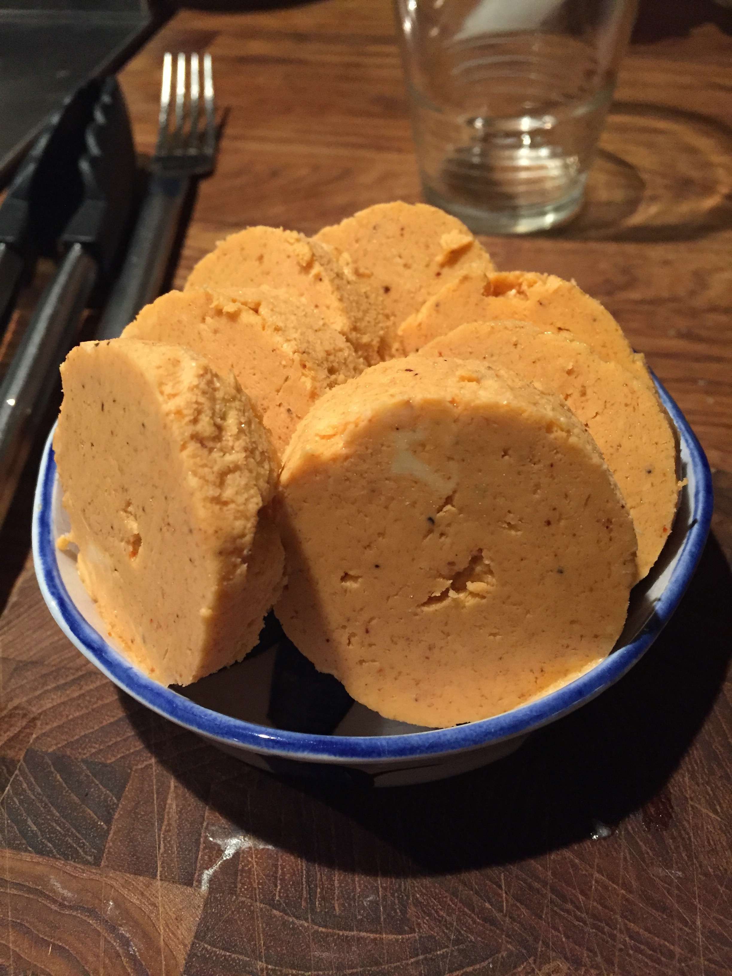 Rör ihop allt och rulla in det i smörpapper som en korv och lägg i kylen.