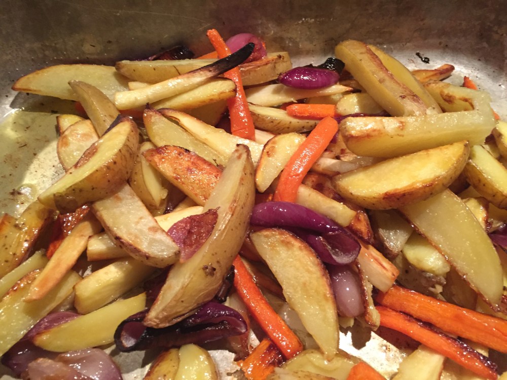 Dela morötter, palsternacka, potatis och rödlök i grova bitar. Blanda allt med lite olivolja och rosta i ugn på 225 grader. Rör om då och då. När det har fin färg så saltar du, rör om och serverar.