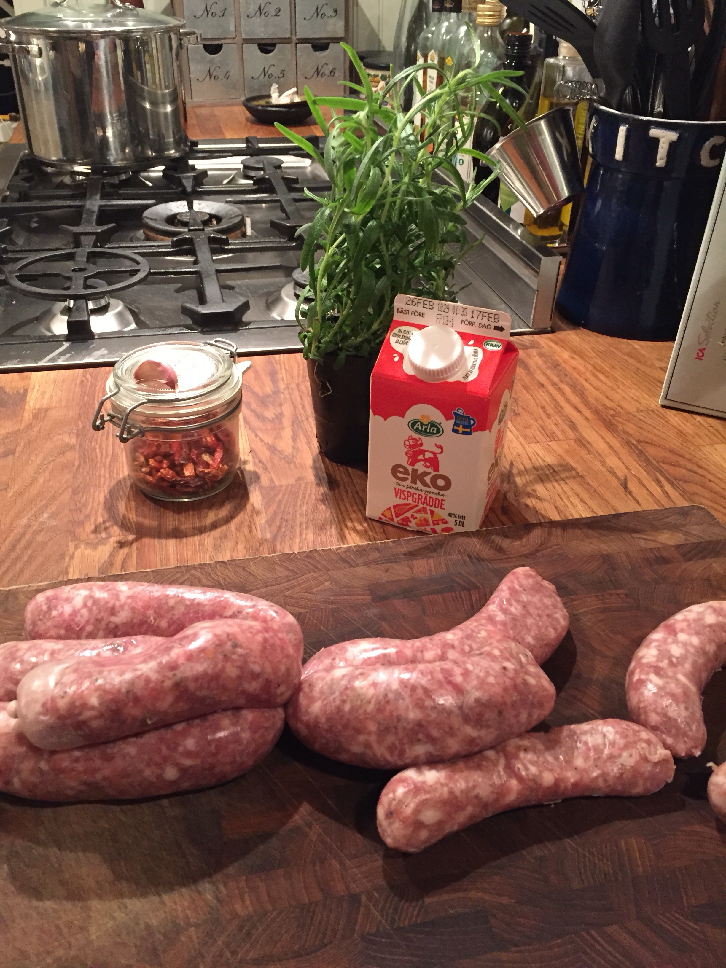 Hade en herrmiddag igår där vi gjorde korv, närmare bestämt salsiccia. Salsiccia är en enkel, färsk korv på fläskkött. Vi kryddade den med fänkål, vitlök och peperoncino (italiensk chili). Det är lätt att göra korv men det blir ganska mycket. Det som blev över gjorde jag en pastasås på idag.