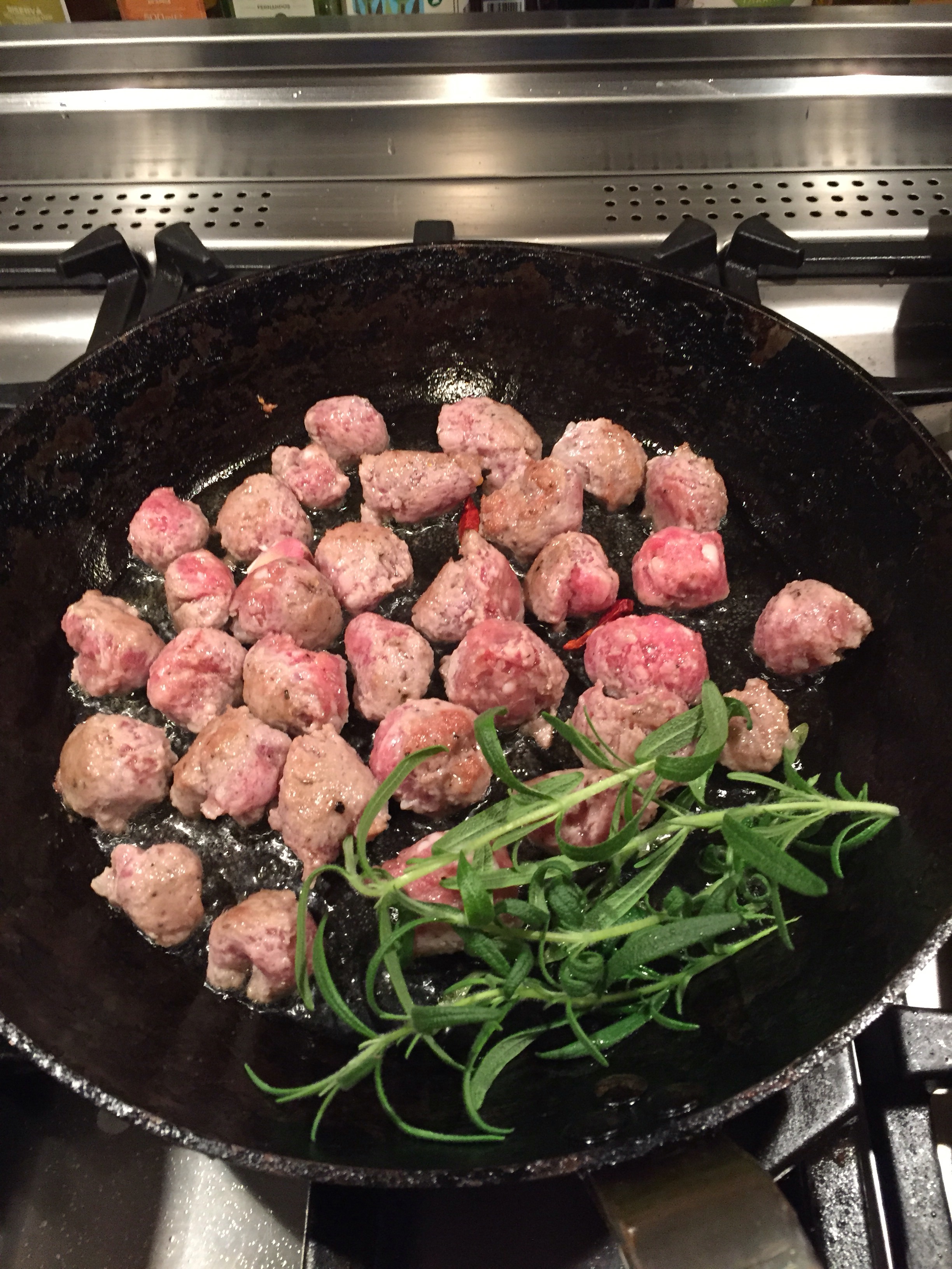 Ta ur färsen ut korven och gör små kluttar eller bullar av köttet. Värm olivoljan i en stekpanna. Stek korvköttet tillsammans med rosmarinkvistar, peperoncino och den oskolade vitlöksklyftan. När köttet har fin färg så häller du på grädden.