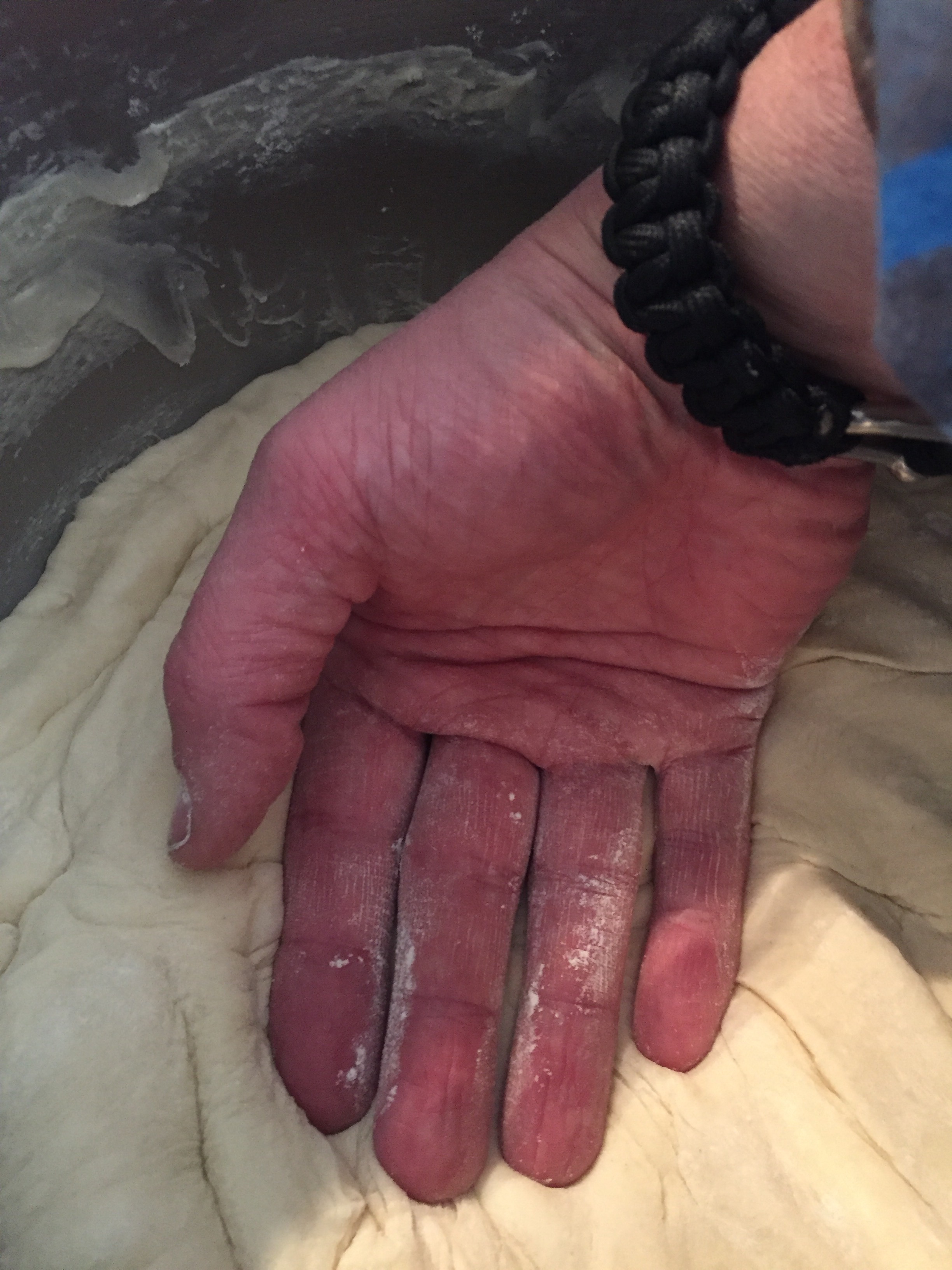 mjölblandningen i ägg- och jästblandningen och knåda i degblandaren i 10 min. Forma degen till en boll genom att rundriva den på ett bakbord. Googla ”rundriva” så förstår du vad jag menar. Lägg tillbaka degen i bunken och täck med plastfolie. Låt jäsa i ca 2 tim.