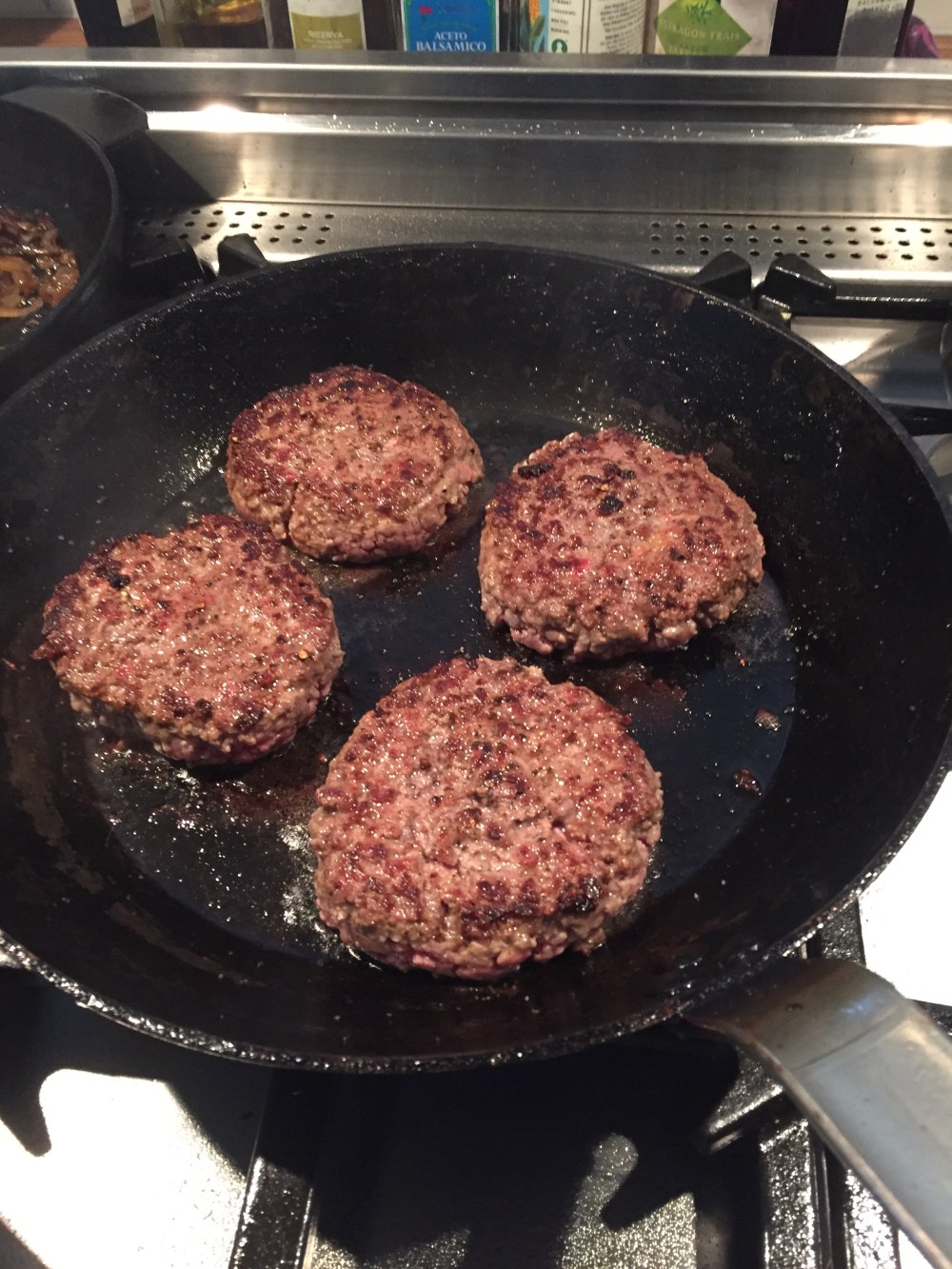 Sätt ugnen på 200 grader. Ta fram köttfärsen och ta försiktigt bort plasten. Ta en vad kniv och skär ut så stora burgare du vill ha. Efterforma dem något. Salta och peppra. Värm en gjutjärnspanna till mycket hög temperatur. Stek burgaren utan fett. Om det behövs kan tu ta i lite olja. Jag använde skirat smör som tål höga temperaturer. Stek burgaren på båda sidor. Jag lät mina vara rosa i mitten men det är en smaksak. När de är stekta ska de vila på en plåt i 5 min.
