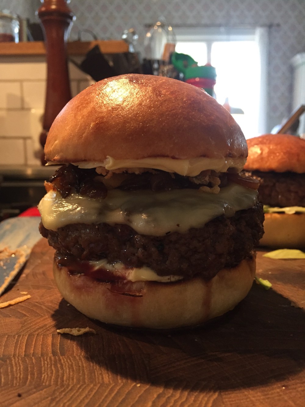 Bred tryffelmajonäs på båda bröden. Snåla inte. Lägg gurka på bottenbrödet. Lägg på burgaren. Toppa med den karamelliserade löken och rostad lök. Lägg på toppbrödet och servera!