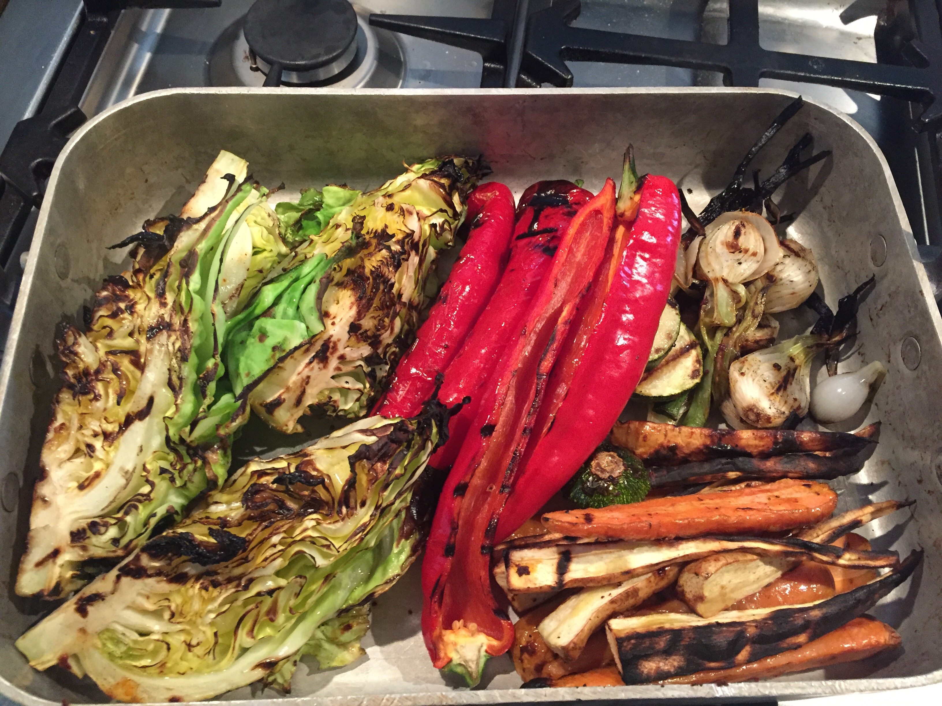 Stänk över lite olivolja och grilla grönsakerna när köttet är nästan klart. Om du inte får plats kan du sätta in köttet i ugnen en stund och låta det gå klart där.
