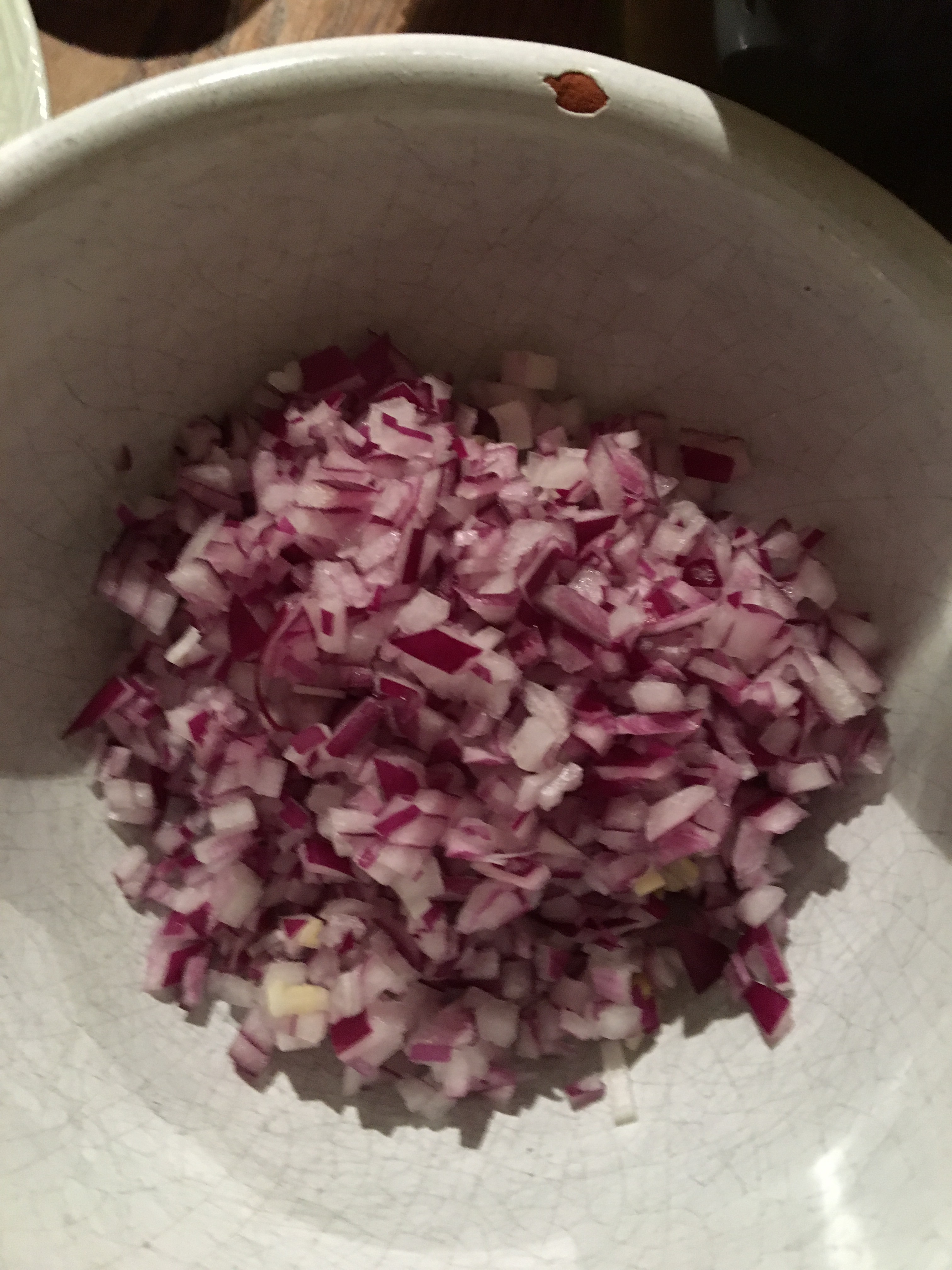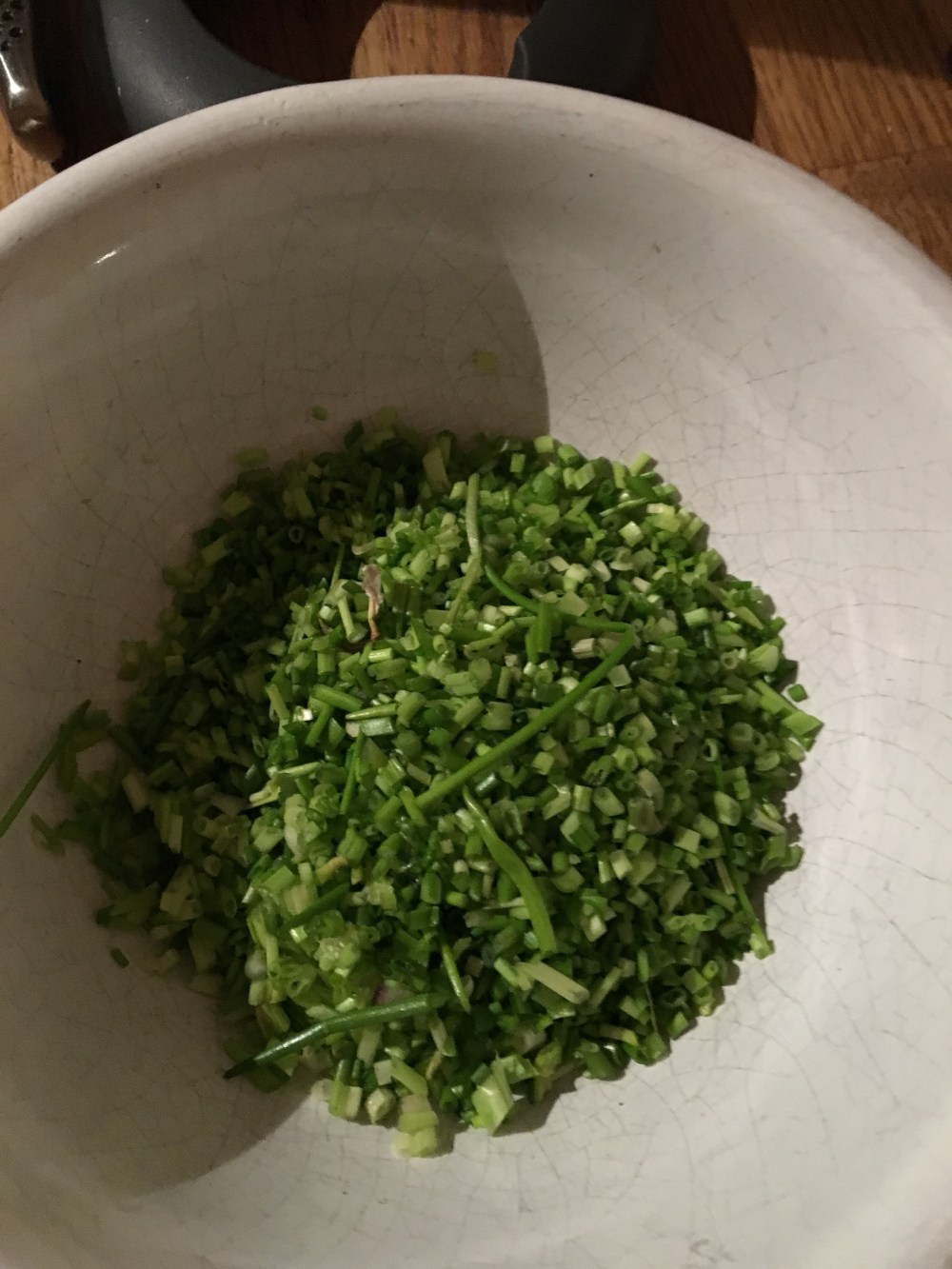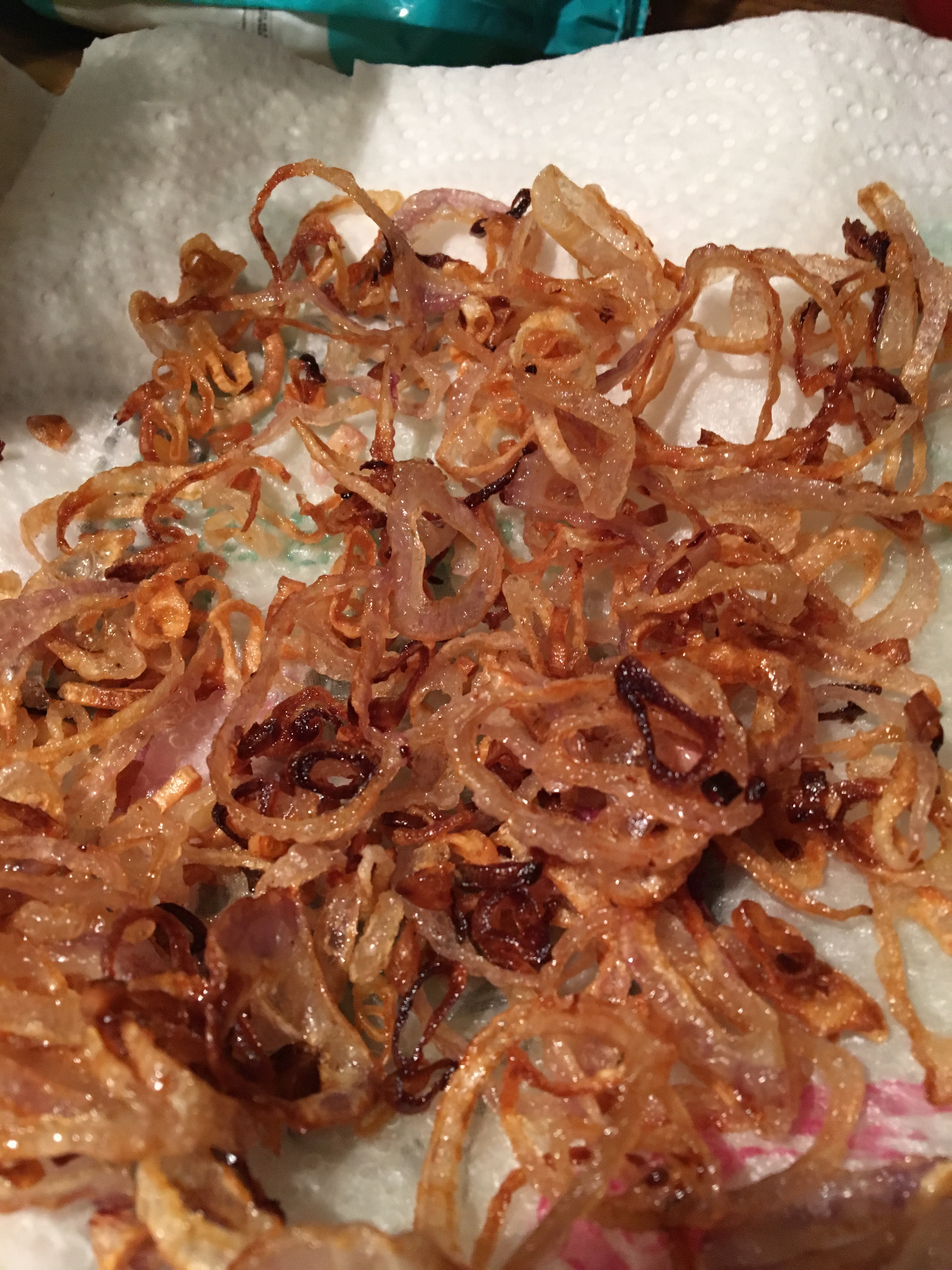 Skiva schalottenlöken tunt. Hetta upp 3 dl olja till 130 grader. Fritera löken i några minuter. Ta upp den med en hålslsev när den börjar bli ljusbrun i färgen och lägg på en tallrik med hushållspapper.