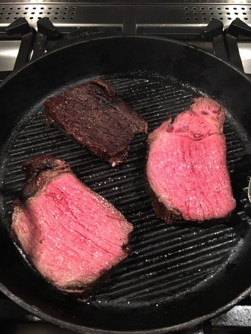 Skiva upp köttet i sex delar och grilla det snabbt i grillpannan.