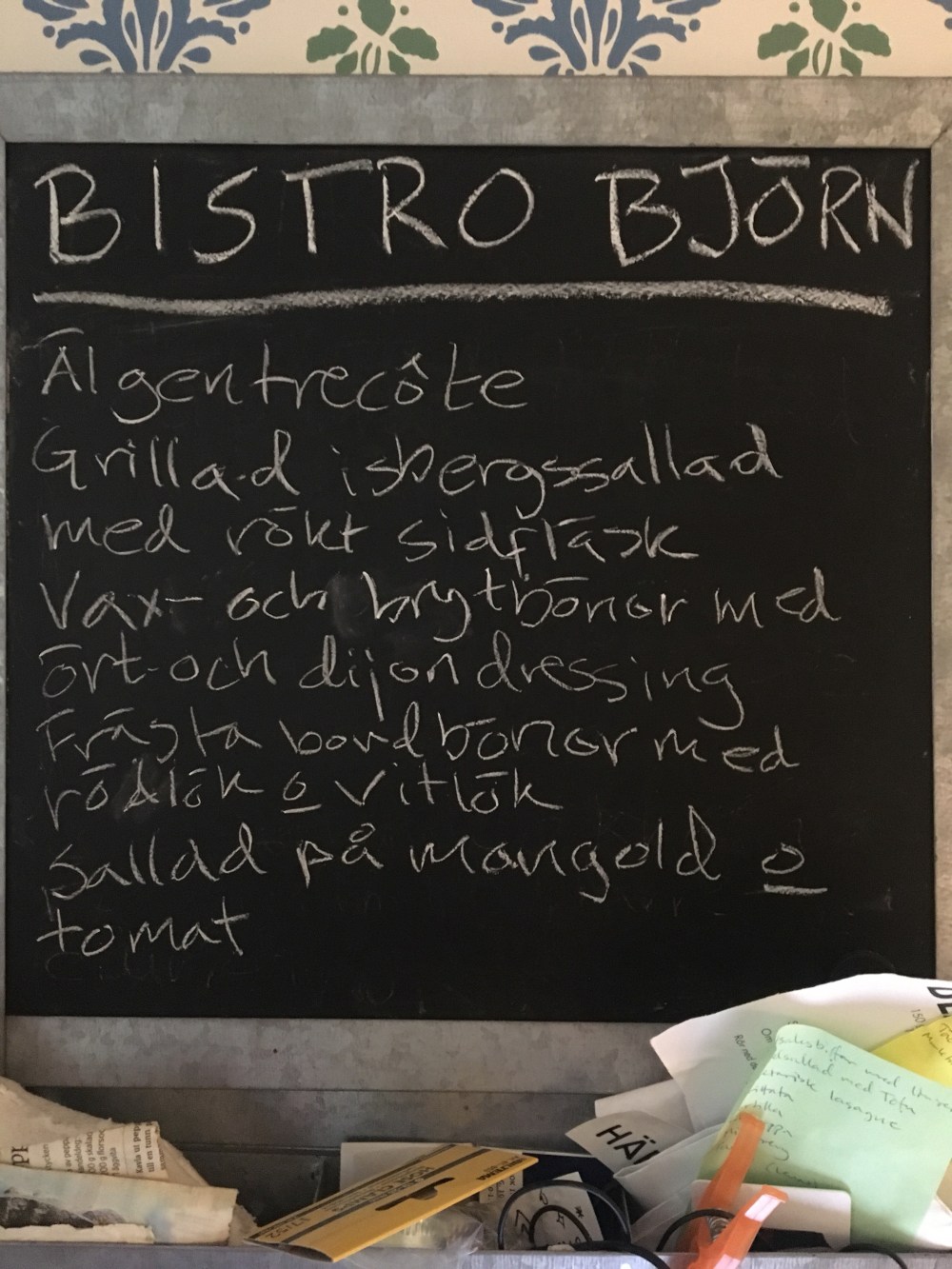 Grillad isbergssallad med sidfläsk, vax- och brytbönor med ört- och dijondressing, frästa bondbönor med rödlök och vitlök, sallad på mangold och tomat och älgentrecote