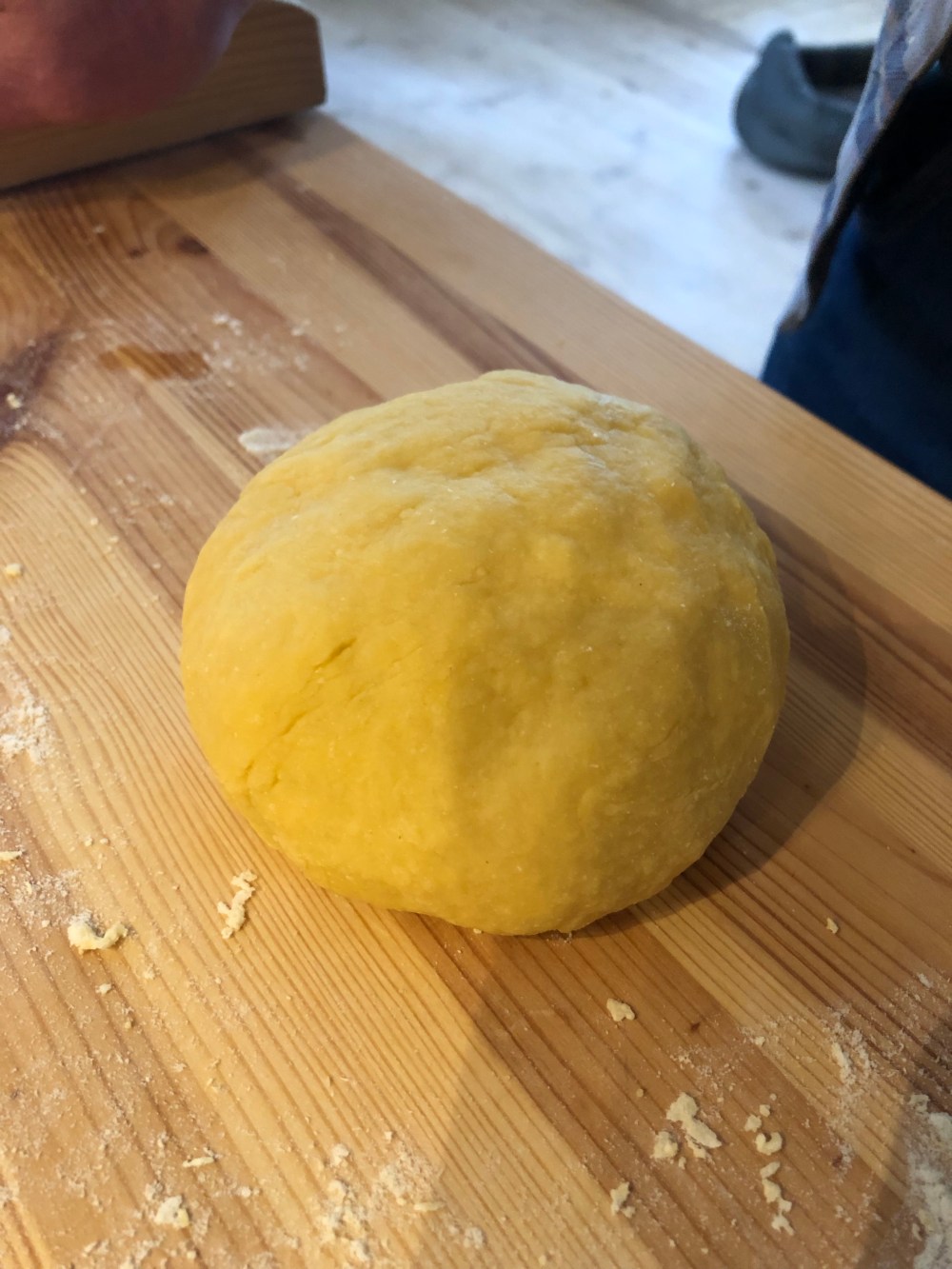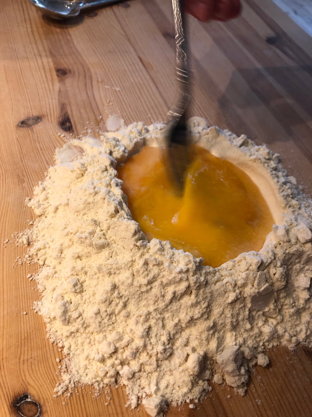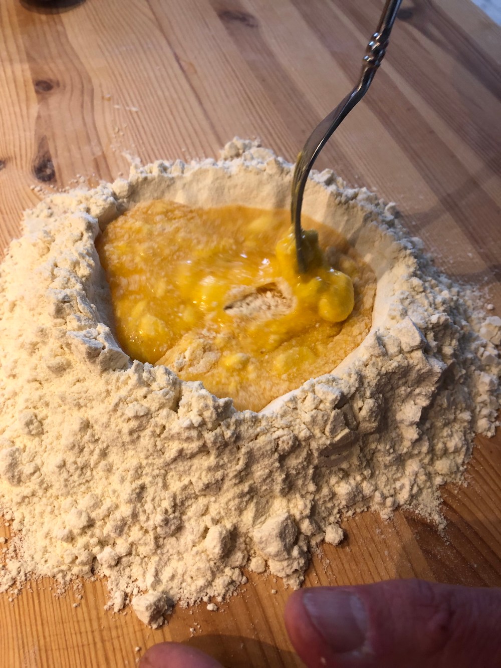 Vispa försiktigt ihop äggen med en gaffel och arbeta gradvis in mjölet från kanterna, först med gaffeln och sedan med fingrarna.