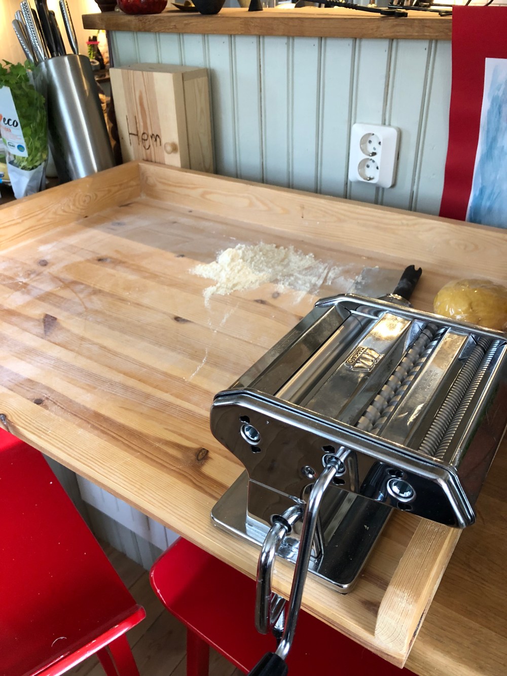Ta fram pastamaskinen och fäst den ordentligt mot köksbänken. Ställ in maskinens valsar på det största avståndet.
