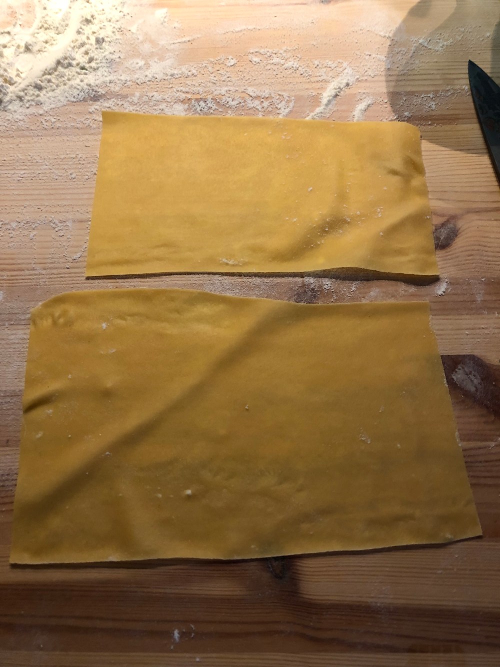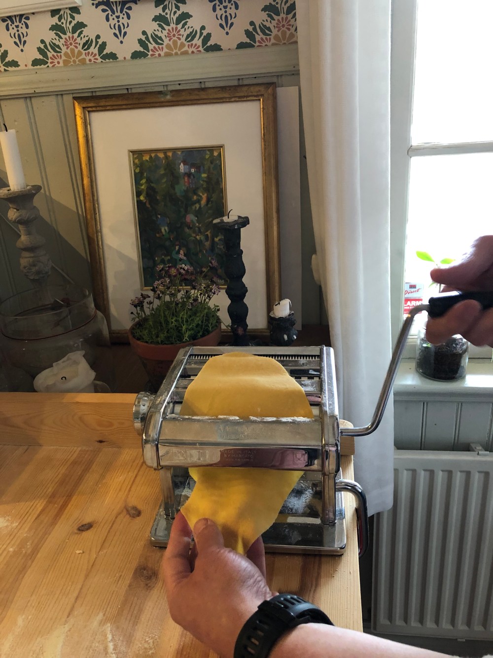 Ta fram degen och dela den i 4 delar. Mjöla dem lite lätt och platta till en bit till en oval skiva lägg tillbaks de andra under plastfolien. Kör biten genom pasta maskinen. Mjöla degen lite om den klibbar eller går sönder. Vik degen tre gånger efter varje gång.