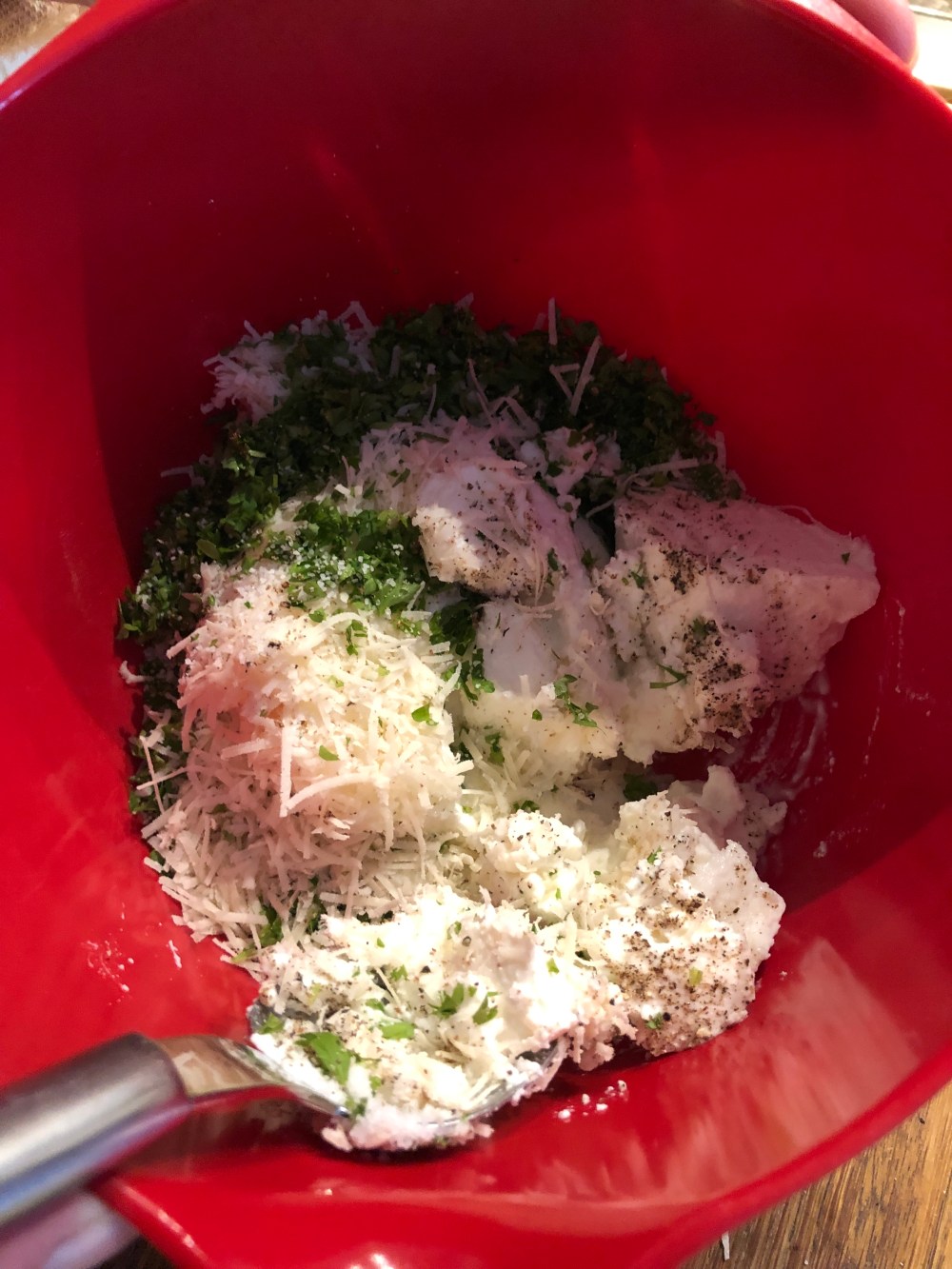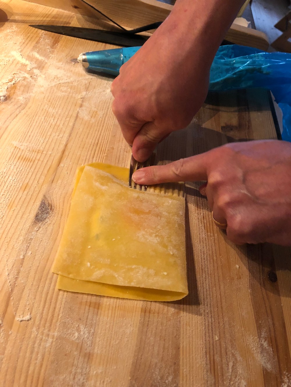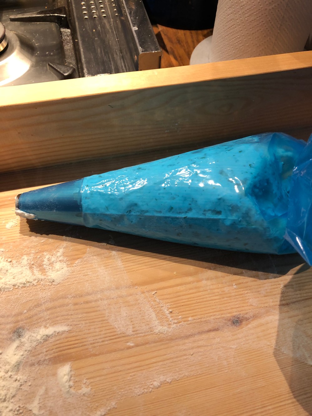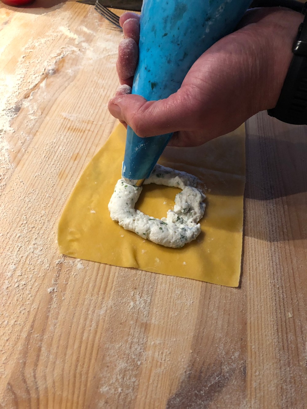 Börja med fyllningen. Blanda ricotta, parmesan, persilja, salt, peppar och muskot. Fyll i en spritspåse med en sprits som är ca 1cm i diameter och ställ kallt tills vidare.