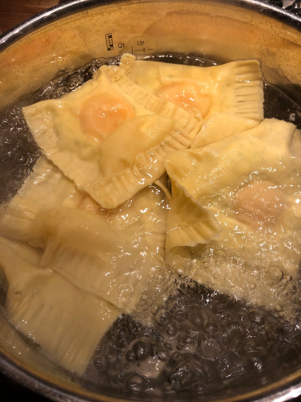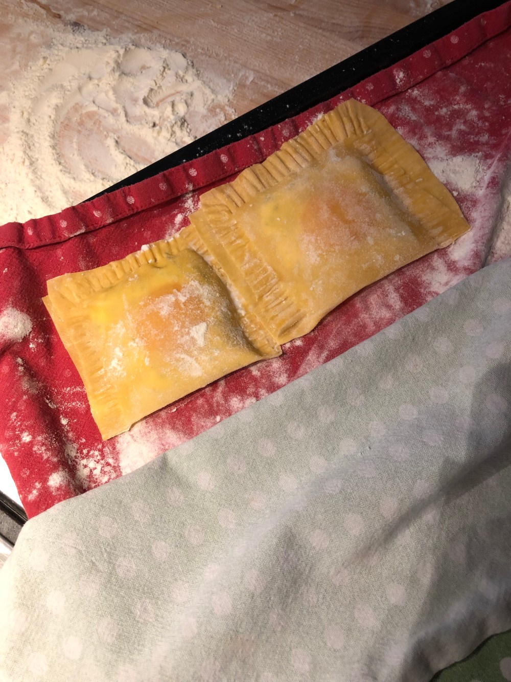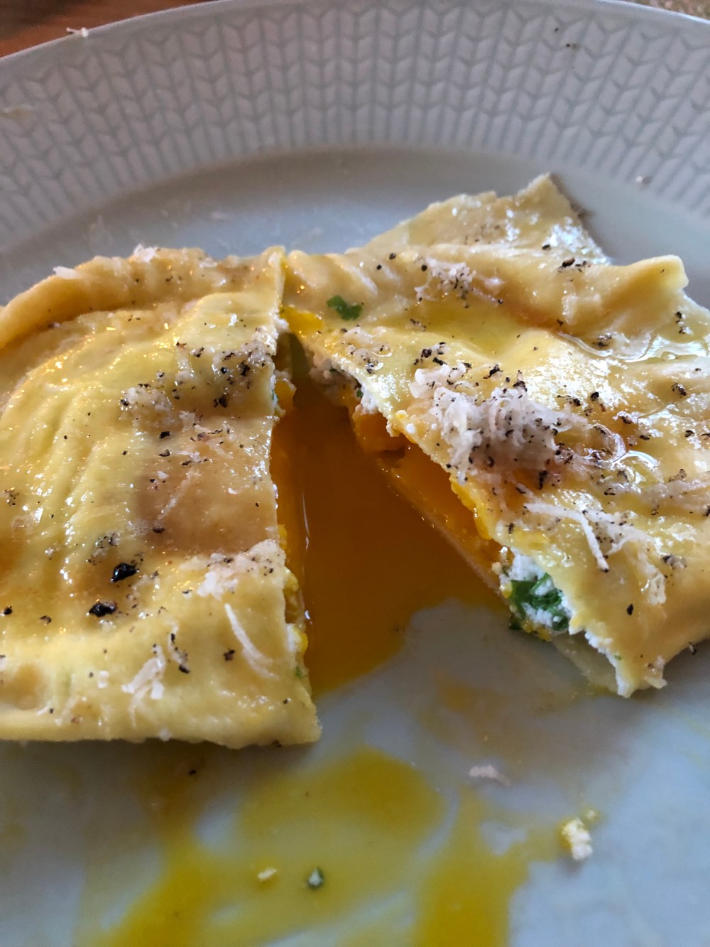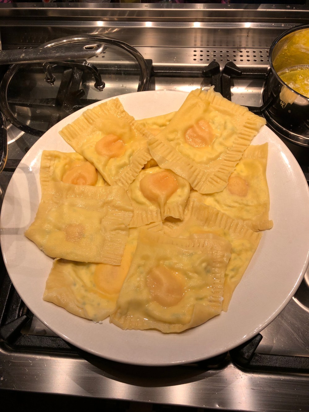 Detta recept är något jag fantiserat om att göra länge, men den kommer nog att bli bättre med vit tryffel. Det var dock väldigt gott och man kan göra den utan tryffel. Det låter som det är lite mat, men två raviolis gjorde mig lagom mätt. Det var också ganska pyssligt men det är det värt.