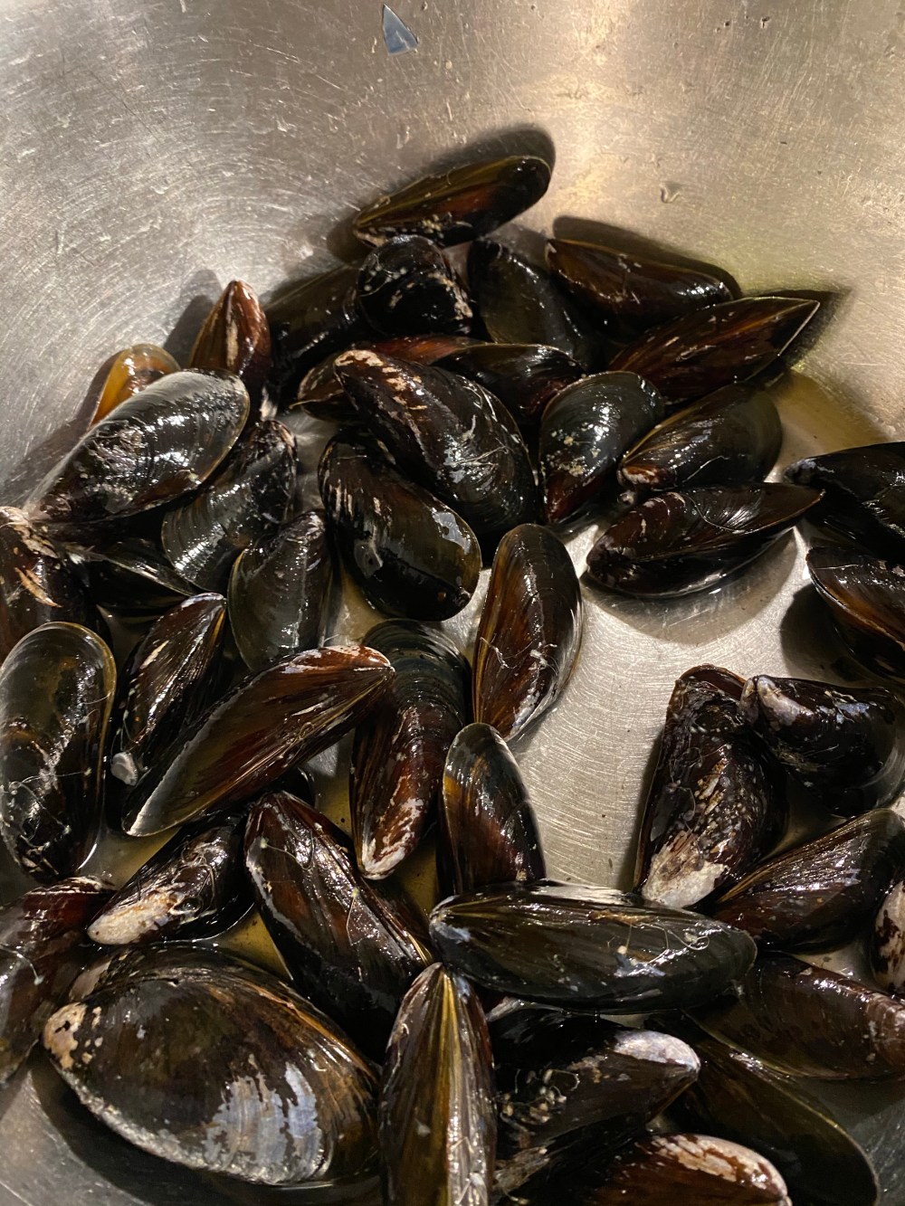 Kasta alla trasiga musslor och de som inte stänger sig när nu du knackat på dem. Skrapa/dra därefter bort det ”skägg” som ibland sitter längs med kanterna, det går enklast med en vass skalkniv.