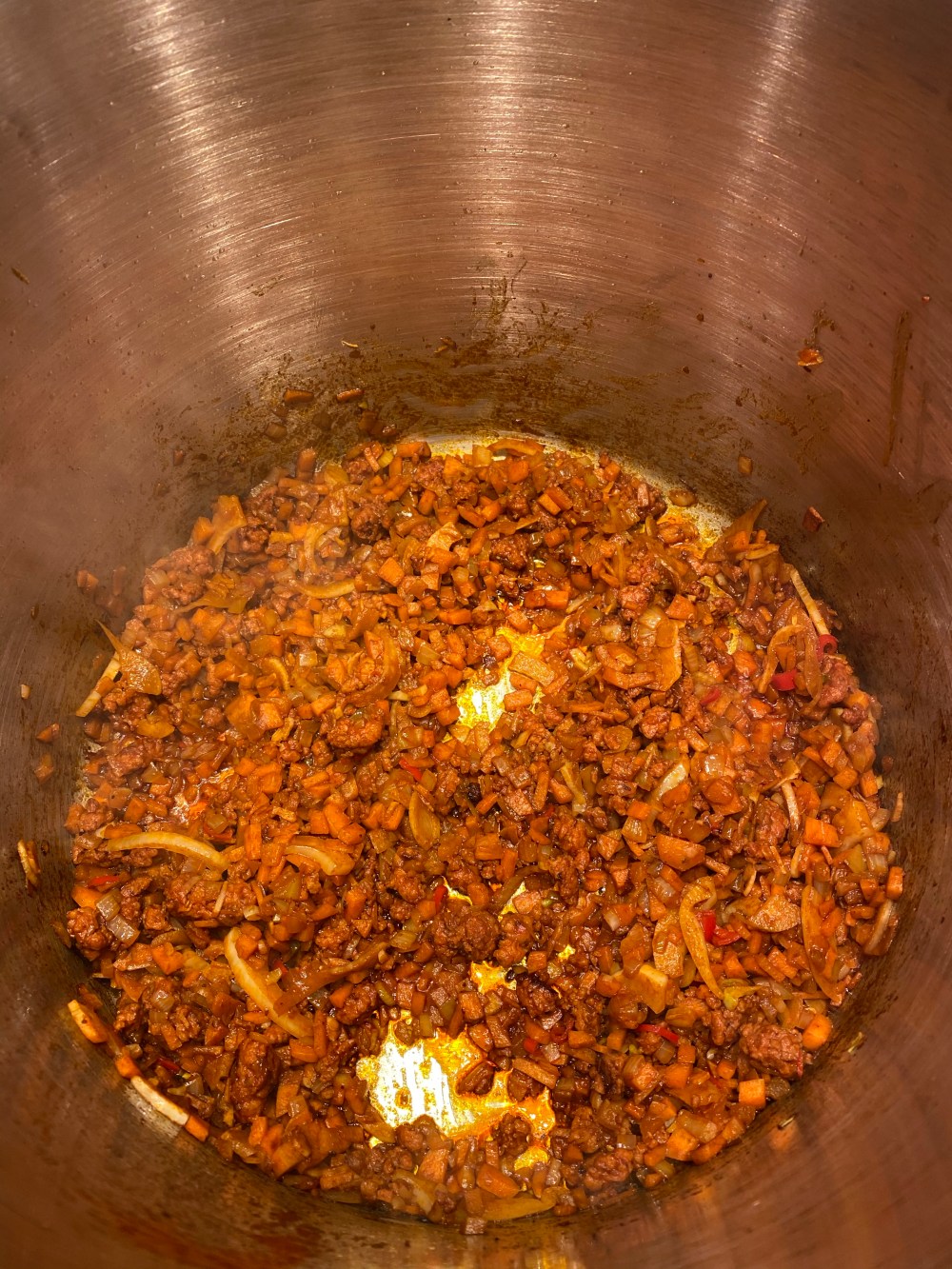 Hetta upp en vid kastrull med olivolja. Lägg i korven och fräs till den börjar få färg och fettet börjar lösa upp sig. Sätt till morot, lök, chili, fänkål och vitlök och fräs tills det har blivit mjukt. Sätt till det rökta paprikapulvret.