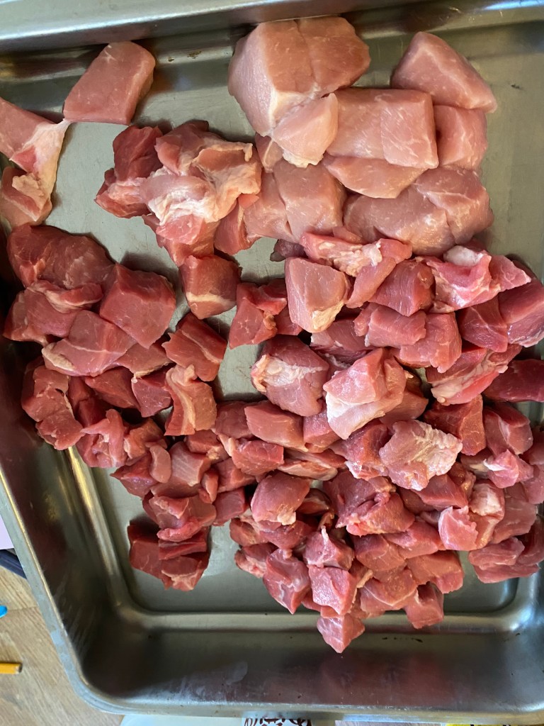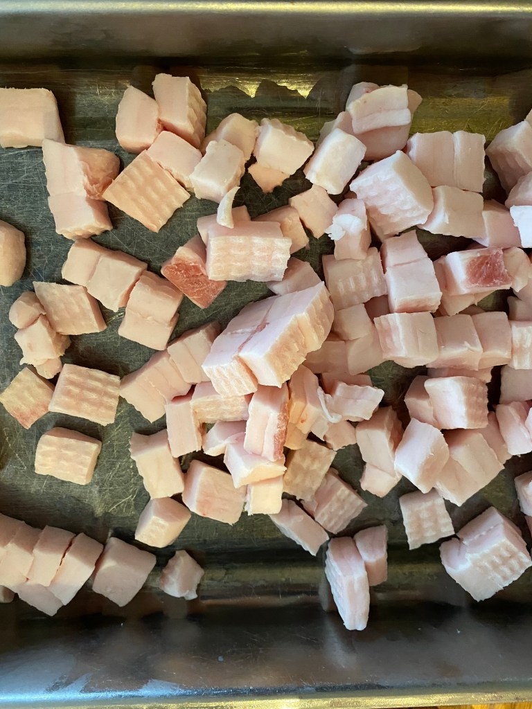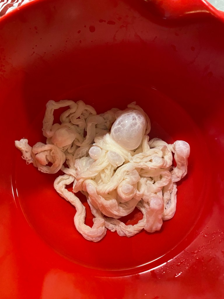 Skär kött och späck i mindre bitar och lägg i en form i frysen. Lägg fjälstret i blöt i en bunke. Spola lite vatten på fjälsterklumpen och snurra ut den. Byt vattnet i bunken. Ta en sil och lägg upp fjälstret i den. Leta upp ena änden och häll i vatten från kran i öppningen. Låt vattnet få igenom hela fjälstret. Upprepa. Lägg allt i blöt igen.