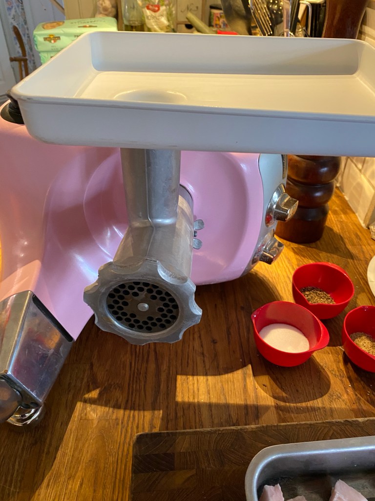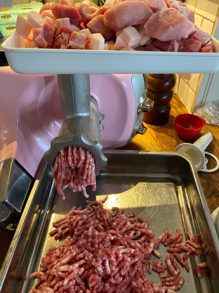 Korv är lätt att göra och den blir fantastiskt god! Det är dock några saker man måste tänka på. Hygien är viktigt, framförallt om du tänkt att frysa in korven och äta den senare. Temperaturen vid tillverkningen är också viktig. Om späcket och köttet är för varmt kommer fettet att fastna på insidan av köttkvarnen och kött och fett binder sig inte med vattnet/vinet du ska ha i. Korven blir grynig i konsistensen. Se till att späcket är fryst och att köttet börjat att frysa på ytan. Lägg också köttkvarn med tillbehör i frysen innan du maler. Använd kylskåpskallt vatten/vin. Receptet kräver att du har en köttkvarn med korvhorn.