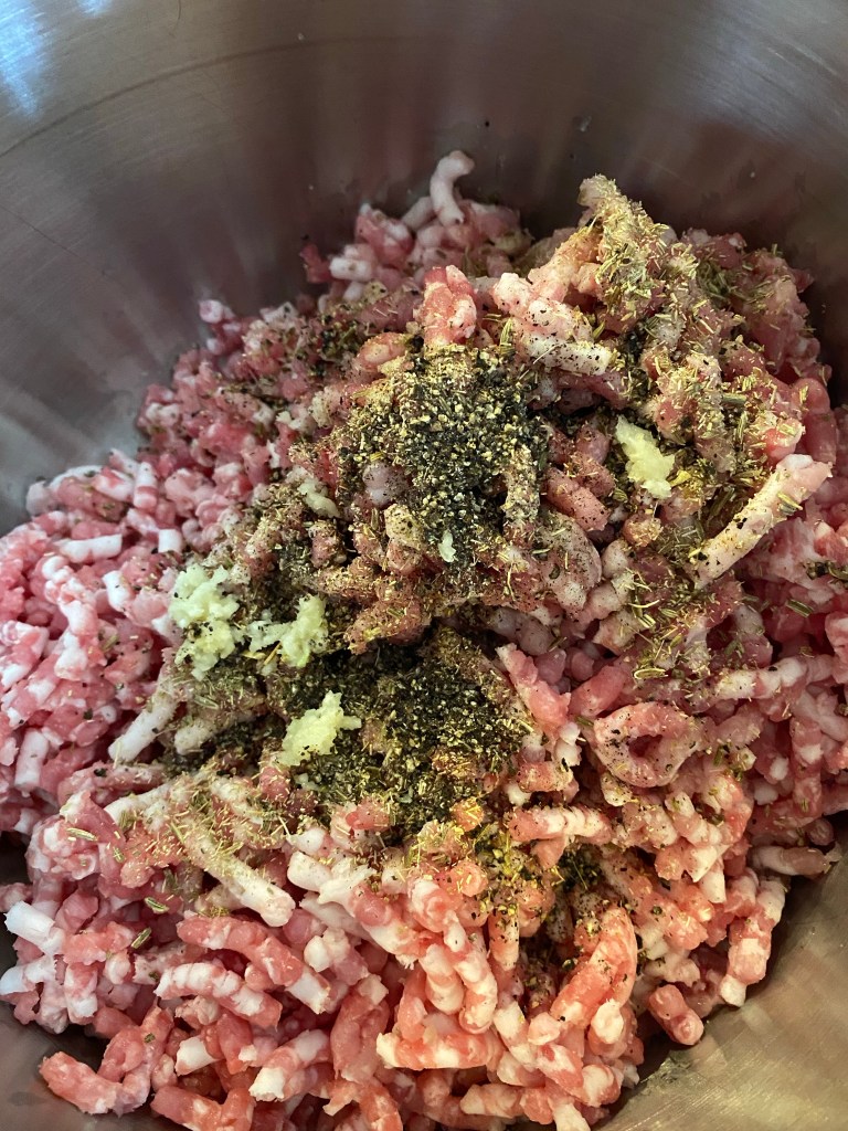 Montera köttkvarnen på din hushållsassistent. Ta in köttet och späcket från frysen. Blanda ihop det och strö över saltet. Mal allt på ett mellangrovt håljärn. Lägg över i en bunke. Ta i peppar, fänkålsfrö, pressad vitlök och vin eller vatten. Blanda samman med en slev.