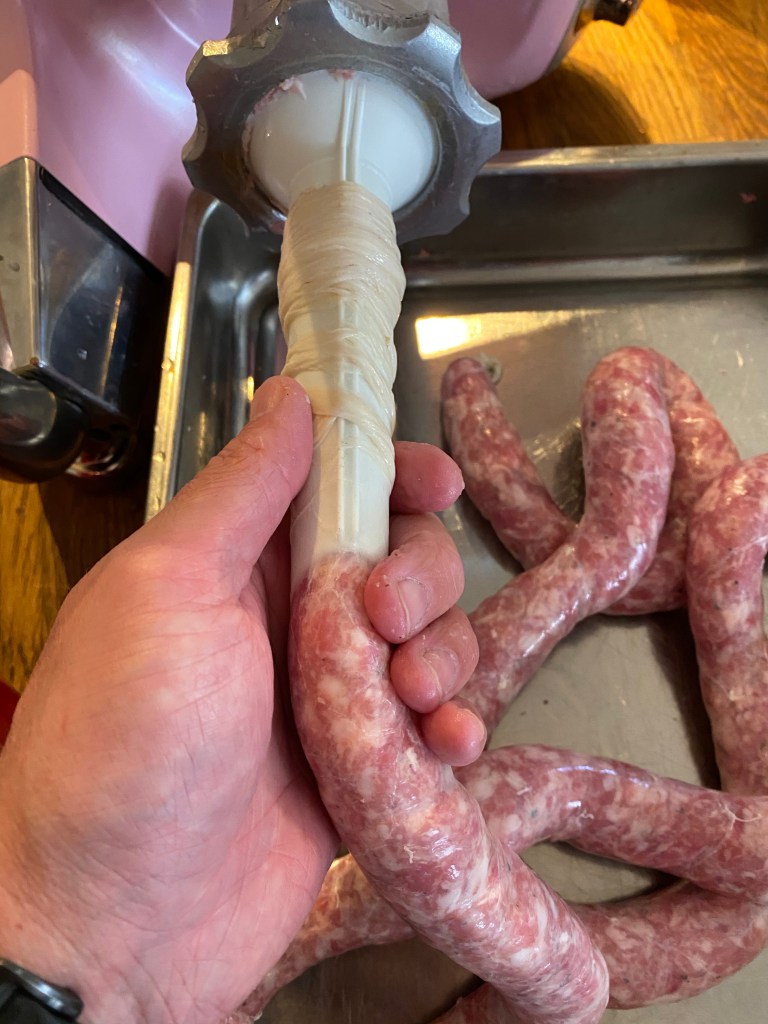 Montera nu på korvhornet. Trä upp fjälstret på korvhornet och mata på med korvsmet. Låt en liten snutt korvsmet sticka ut. Stäng av maskinen och knyt en knut om änden. Låt det bli en enda lång korv. Är man snitsig kan man snurra till korvar medan man håller på, men det är inte nödvändigt. När all smet är i maskinen så fyller du på med knäckebröd tills du börjar se att det kommer ut ur korvhornet. Dra av fjälstret och kapa det om det behövs. Knyt en knut i änden.