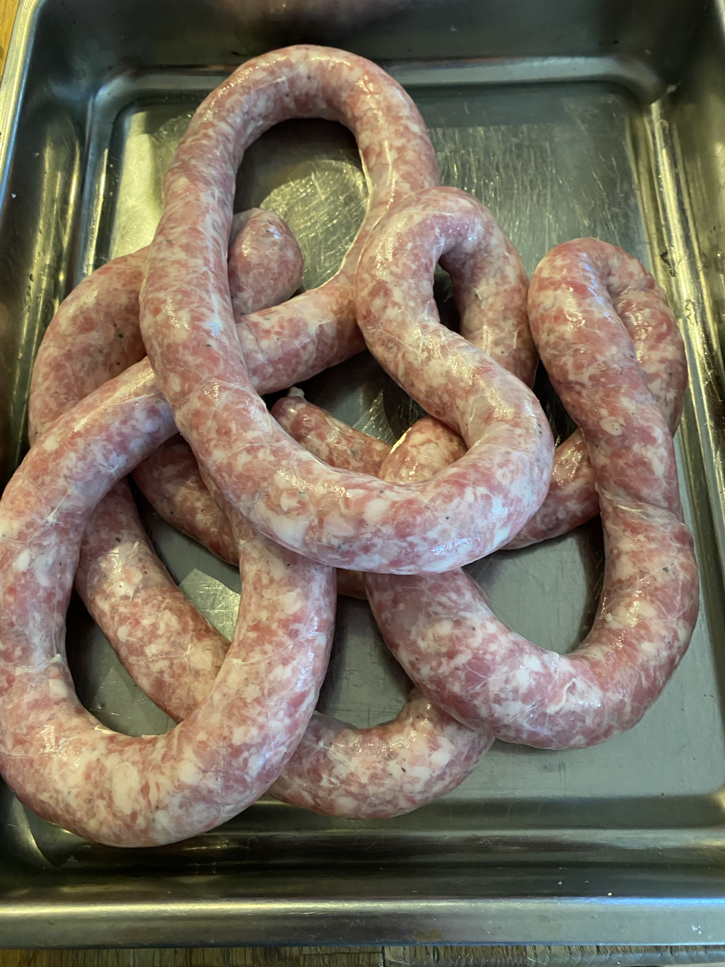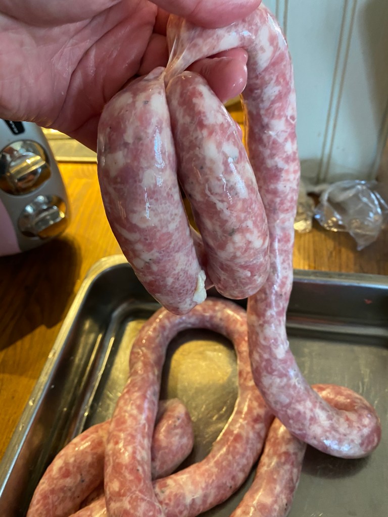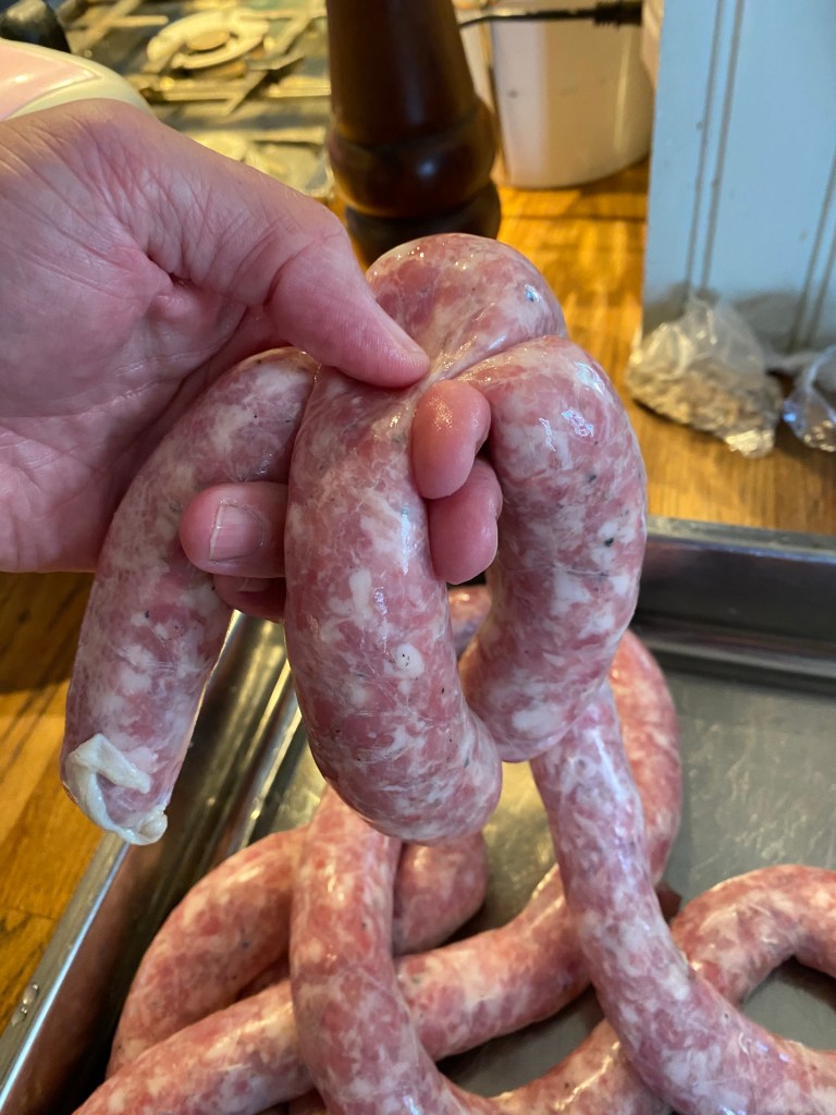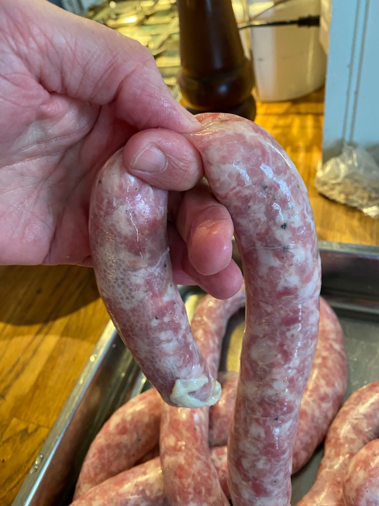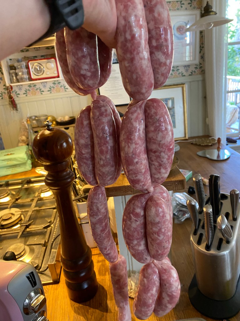 Låt korven dra i en form i kylen. Gärna utan plastfolie så att ytan torkar lite. När den legat ett tag kan du skära ut och förpacka korven som du vill. Den är god att grilla med en tomatsallad och grillat bröd till eller varför inte en pasta?