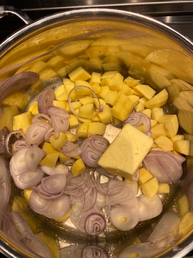 Koka potatis och lök i vin och smör i ca 5 minuter.