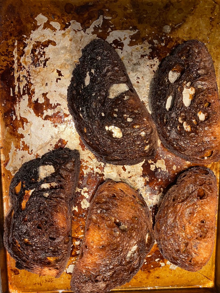 Skiva supertunna skivor av brödet och lägg dem på en plåt med bakplåtspapper under.