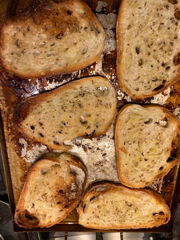 Strö över lite flingsalt, krossat dillfrö och ringla över olivolja. Ugnsbaka ca 5-10 minuter tills de fått fin färg. Ha koll på brödet så det inte blir bränt.