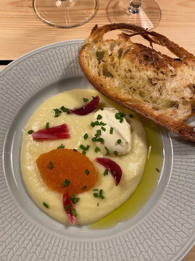 Lägg upp lite mandelpotatiskräm i en liten skål eller på små tallrikar. Toppa med lökklyftorna, löjrom, gräddfil och finhackad gräslök. Ringla över lite olivolja och servera den krispiga dillfröskorpan till.