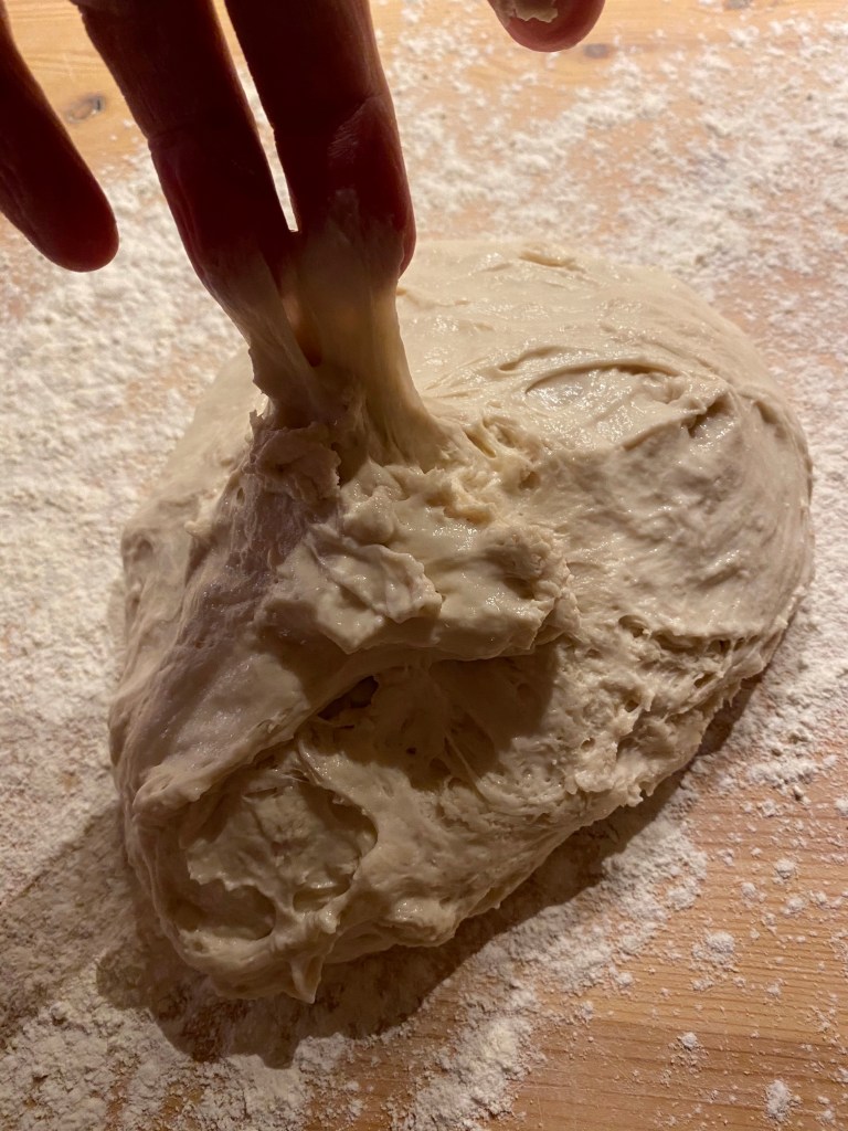 Mjöla en ren yta och ta ur degen med en slickepott. Degen ska vara ganska kladdig. Mjöla lite på toppen. Vik degen en gång och rulla sedan ihop den försiktigt. Mjöla igen och upprepa.