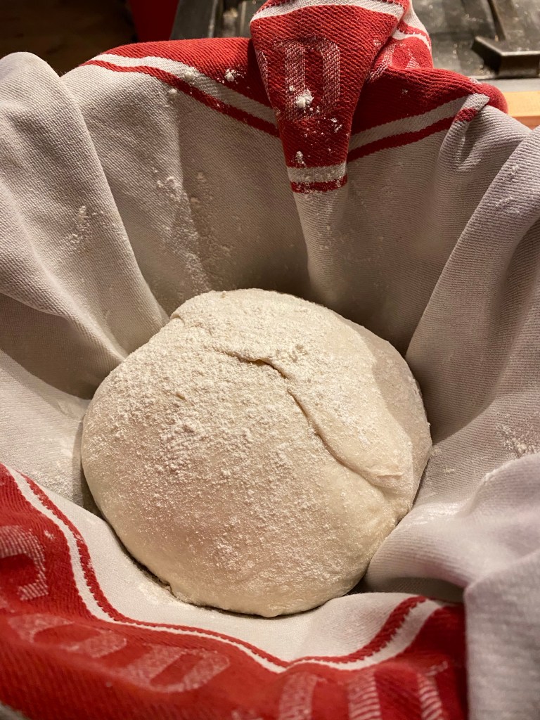 Lägg en bakduk i bunken och mjöla lite. Lägg ner degbollen, strö lite mjöl ovanpå och vik in sidorna på bakduken. Låt degen jäsa i 1-2 timmar.