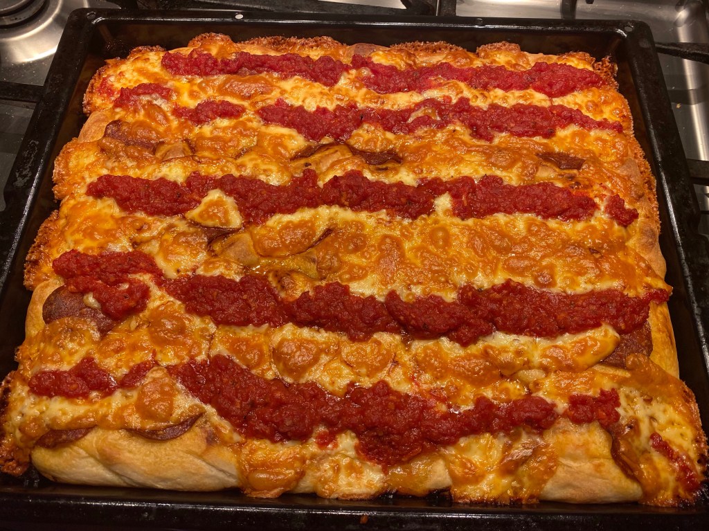 ”Tjockpizza” eller panpizza är egentligen något annat än en vanlig pizza. Mer som en foccacia men ändå väldigt god. Enligt originalreceptet så byggs pizzan tvärtom mot en vanlig pizza. Köttpålägget läggs på först, följt av osten och sist tomatsåsen. Resultatet blir väldigt gott och mättande och det är enklare att slänga in en långpanna än att baka enskilda pizzor åt var och en.