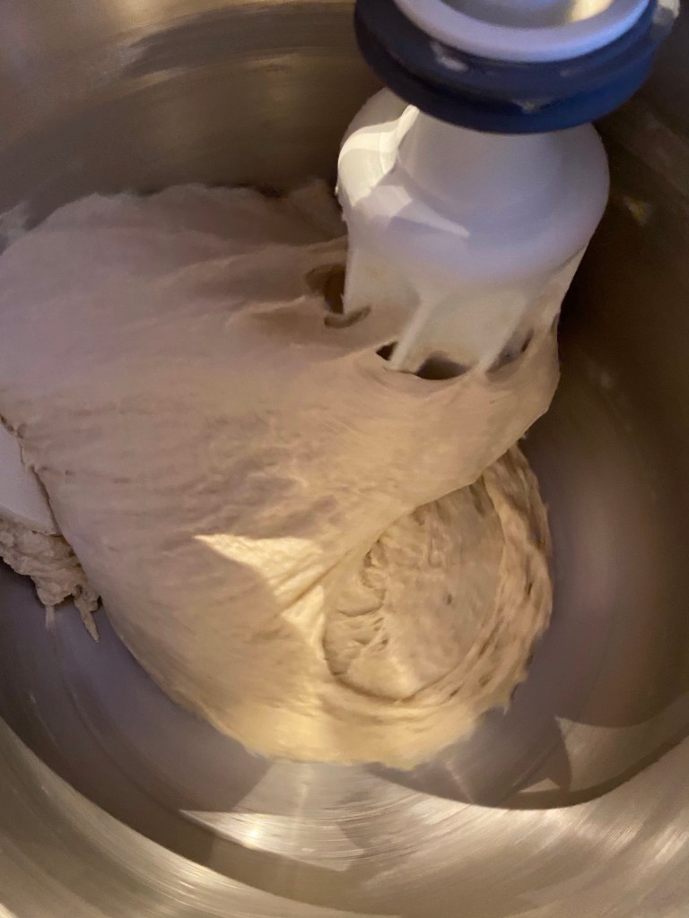 Ta fram en hushållsassistent om du inte vill knåda för hand. Mät upp mjöl och lägg i bunken. Blanda torrjästen med det ljumma vattnet. Starta assistenten och ta i jästvattnet. Låt gå i ett par minuter och ta i saltet. Låt assistenten gå i ytterligare 8 minuter.