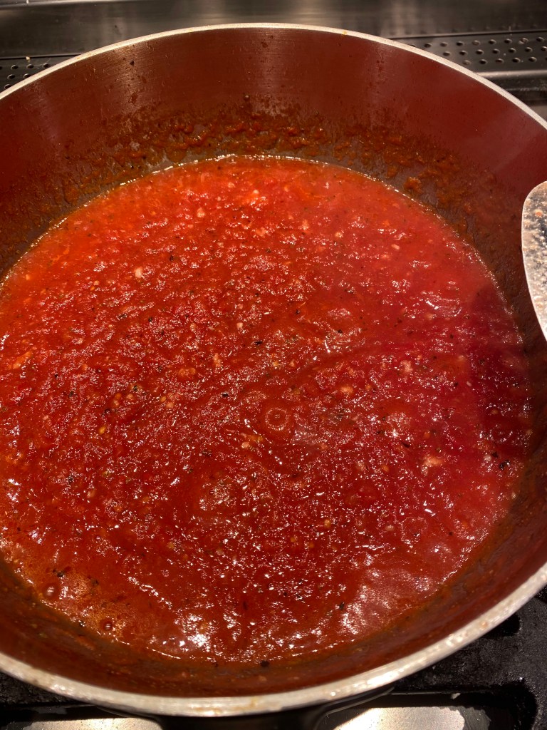 Ta i olivoljan i en kastrull och sätt den på medelvärme. Ta i alla kryddorna och den pressade vitlöken och fräs i 30 sek. Ta i tomaterna. Ta gärna lite vatten i burkarna så du får ut allt. Låt puttra i 30 min. Smaka av med salt