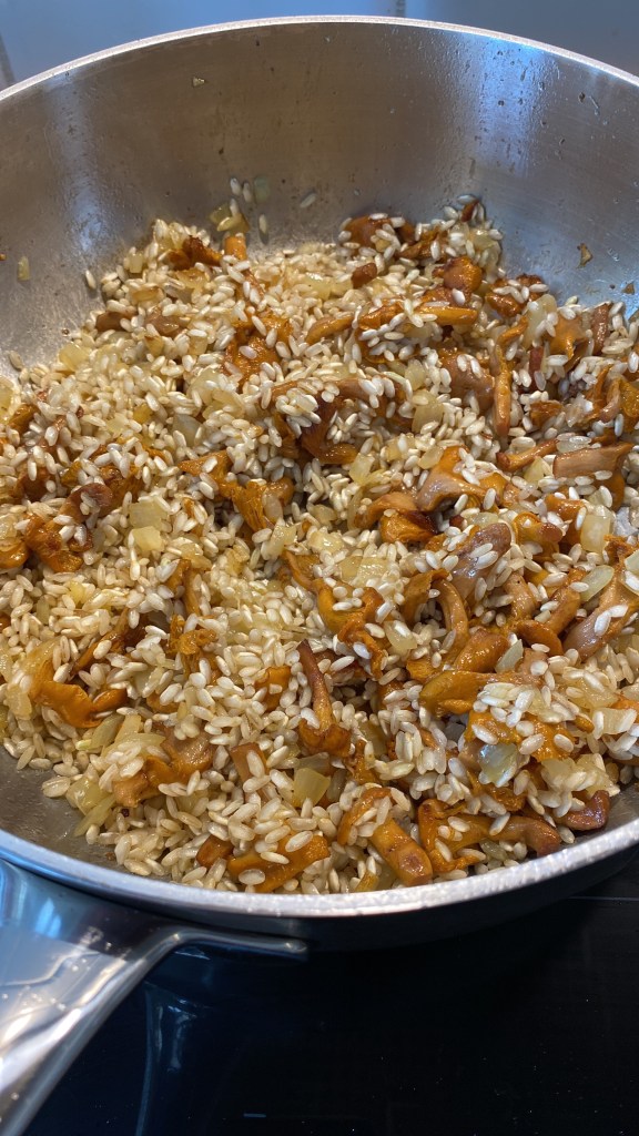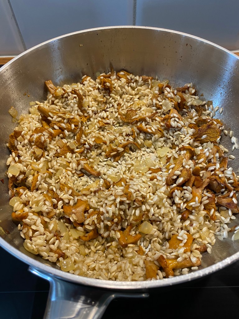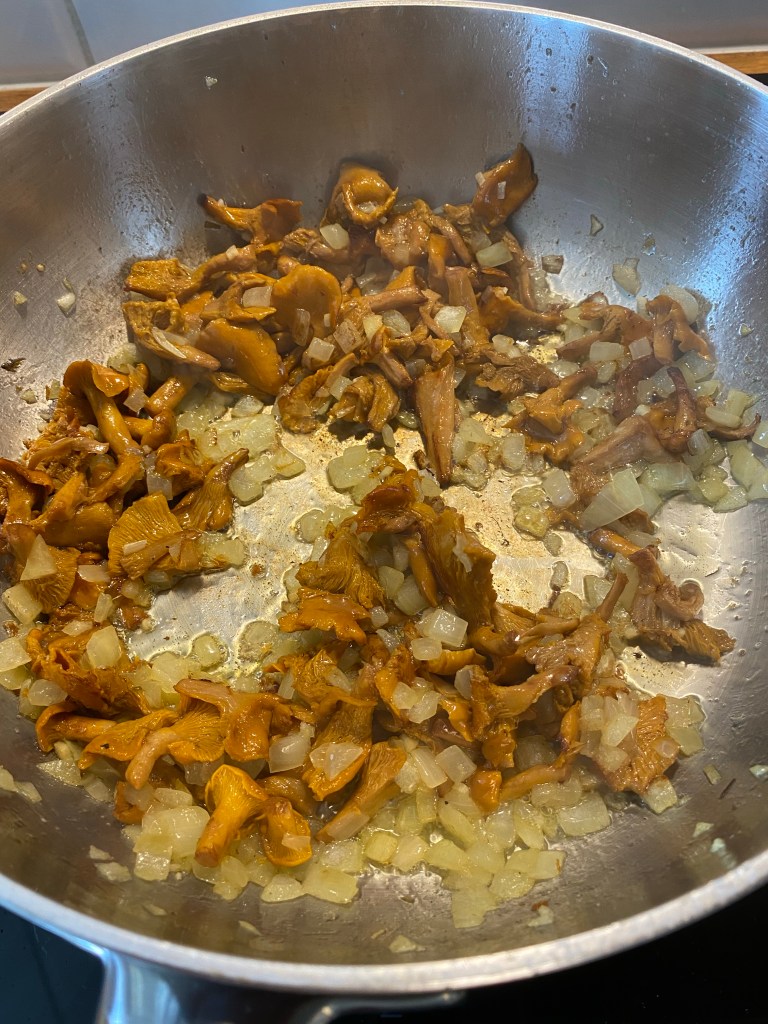 Ta i smör och olivolja i en bred panna med höga kanter. Låt lök och vitlök svettas utan att ta färg. Sätt till kantarellerna. Låt steka en liten stund på medelvärme.
